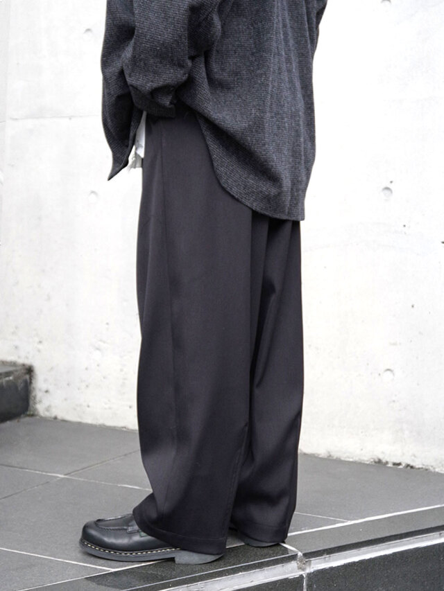 デッドストックの生地を用いた特別なラインナップで、ブラックはウール×ポリエステル混紡素材を採用。上品な微光沢と程よいハリ感があり、穿いたときに美しい立ち姿を描きつつ、シックでクラシックな雰囲気を併せ持っています。