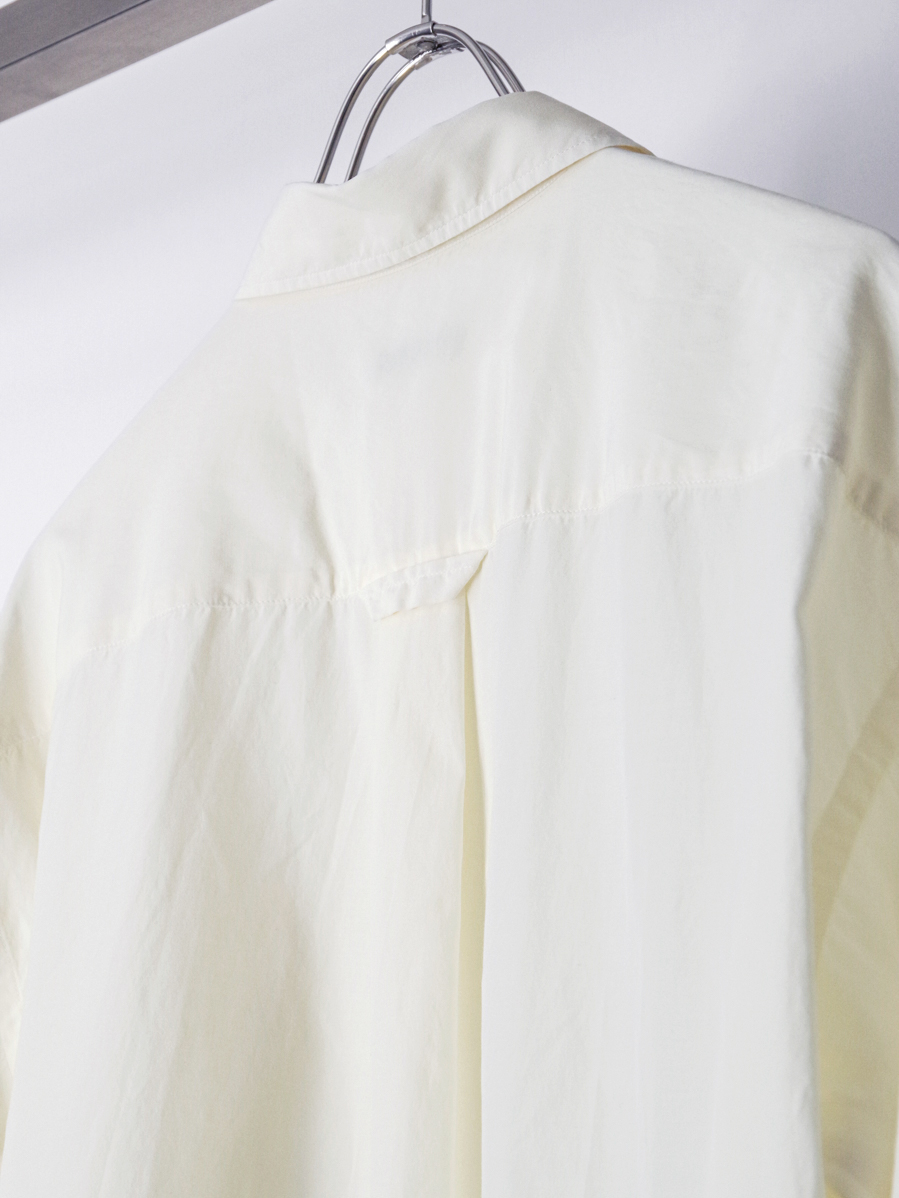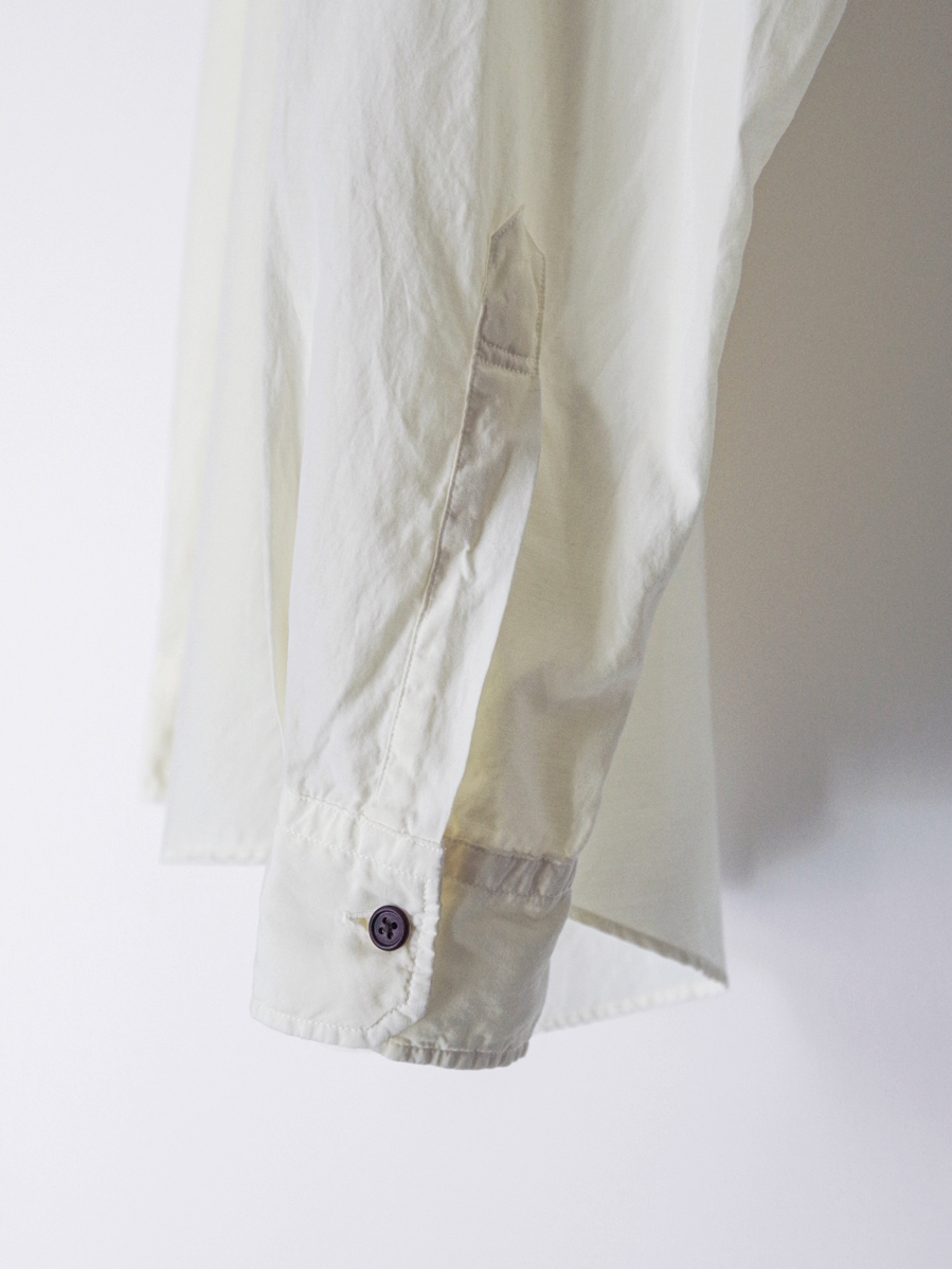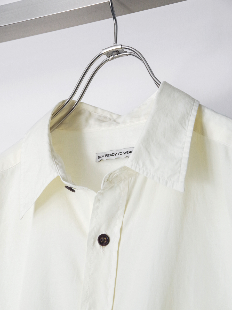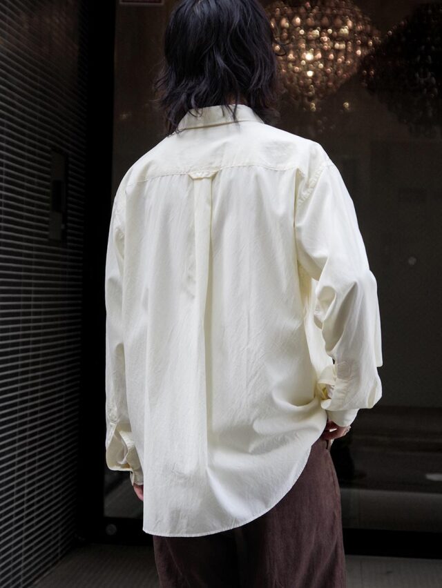 シャツ作りに定評のあるsoeならではの完成度で、シルエットのバランス、色味、質感、ボタンの選定に至るまで丁寧に整えられた仕上がりです。シンプルな佇まいの中に、細部まで行き届いた設計が感じられます。