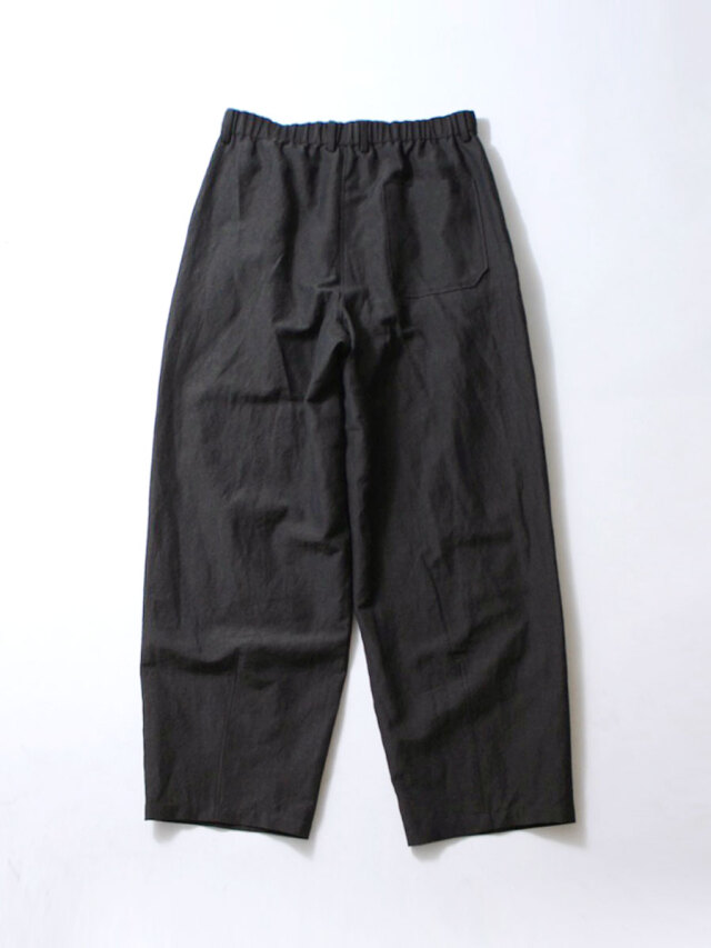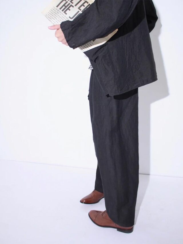 シルエットは、脚のラインを美しく見せる弱テーパード。腰元にダーツを入れて広がりを抑え、さらに裾にもダーツを取ることで全体のボリュームを丁寧にコントロールしています。ヘムラインはすっきりと整えられ、落ち着いた大人の印象に仕上げられています。