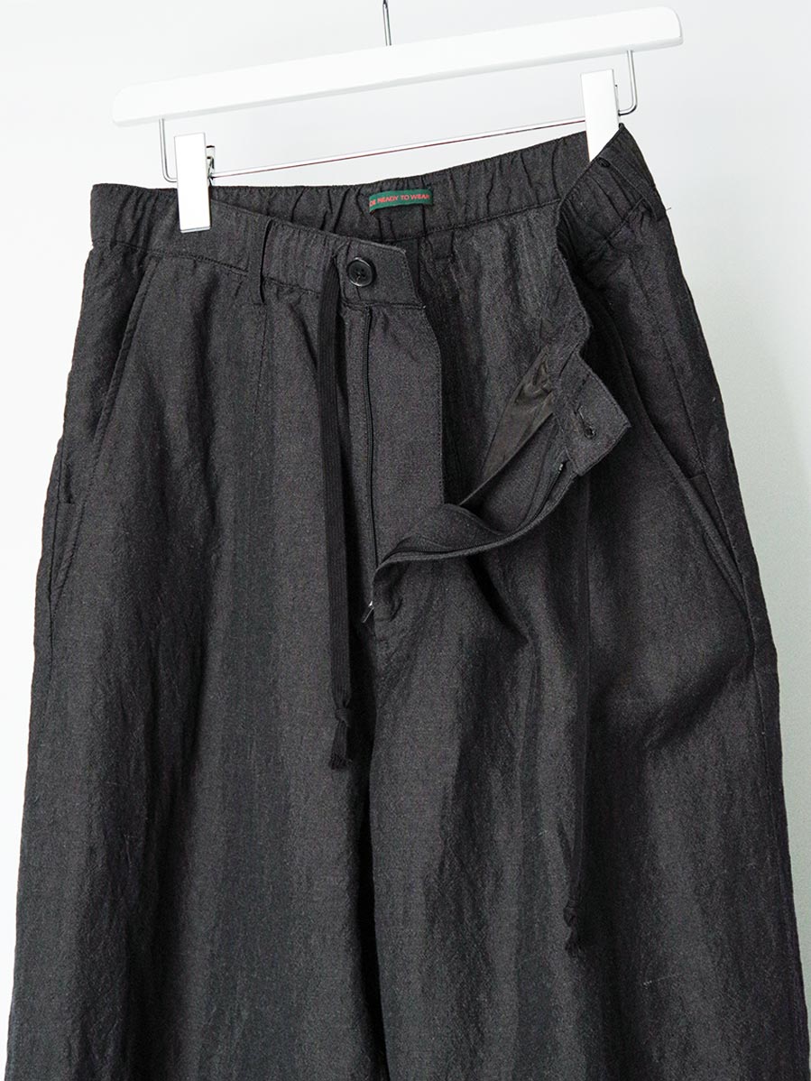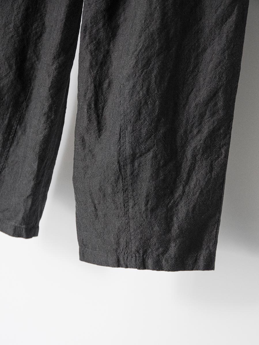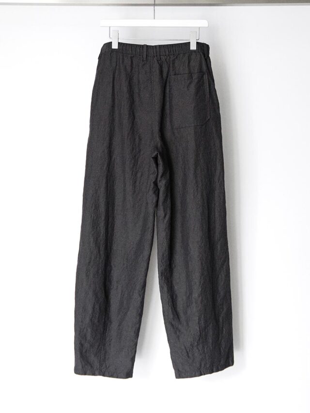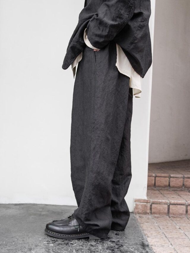 生地にはウールとリネンをブレンドした素材を採用。天然素材ならではのドライで奥行きのあるタッチが特徴で、生地表面には豊かな陰影が生まれます。通気性にも優れており、気温の高い季節でも快適な穿き心地を保ちます。
