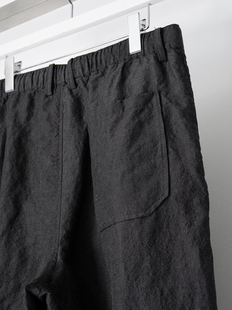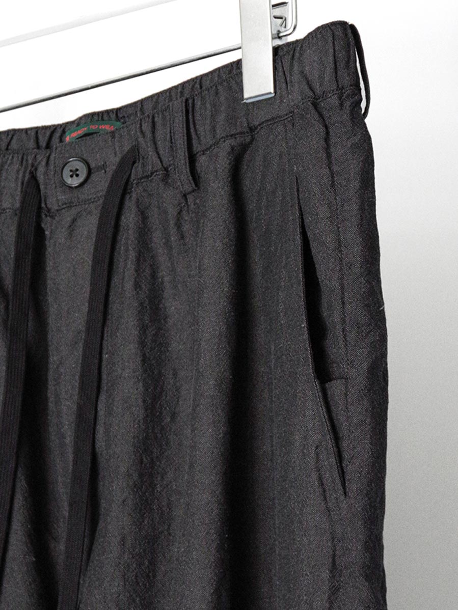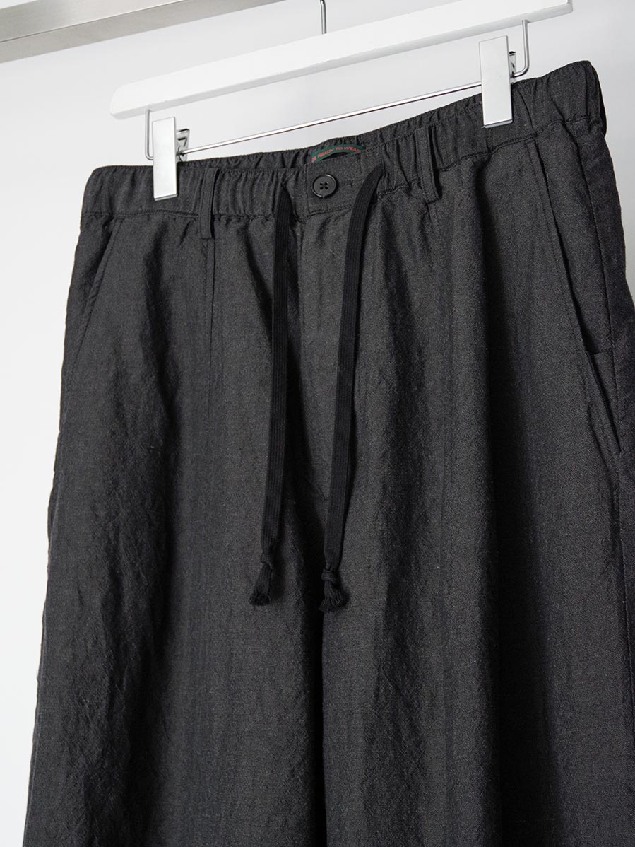 生地にはウールとリネンをブレンドした素材を採用。天然素材ならではのドライで奥行きのあるタッチが特徴で、生地表面には豊かな陰影が生まれます。通気性にも優れており、気温の高い季節でも快適な穿き心地を保ちます。