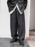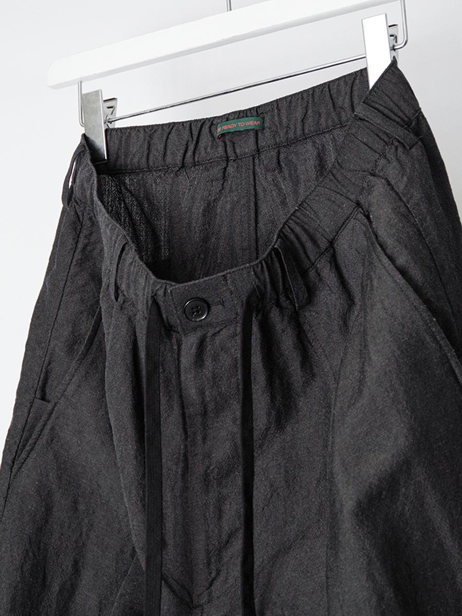 The silhouette features a gentle taper that enhances the line of the legs. Darts at the waist reduce excess volume, while additional darts at the hem carefully control the overall shape, resulting in a clean hemline and a refined, mature impression.