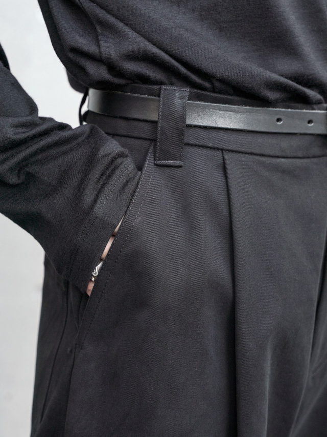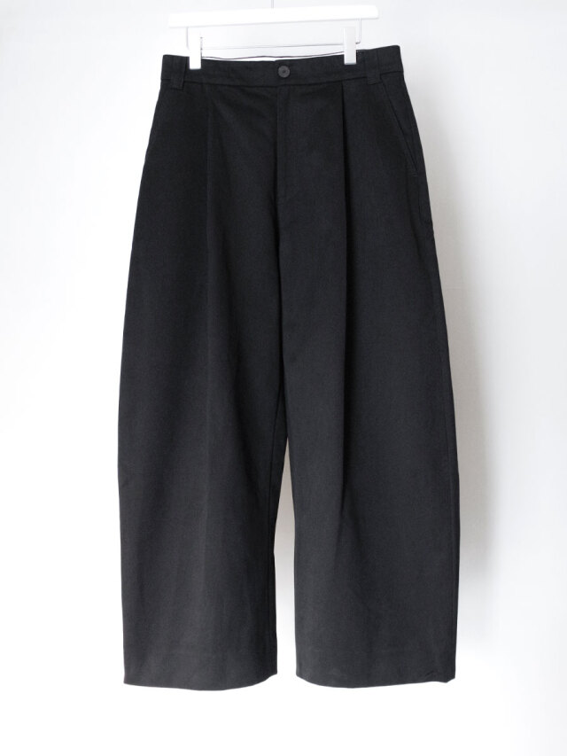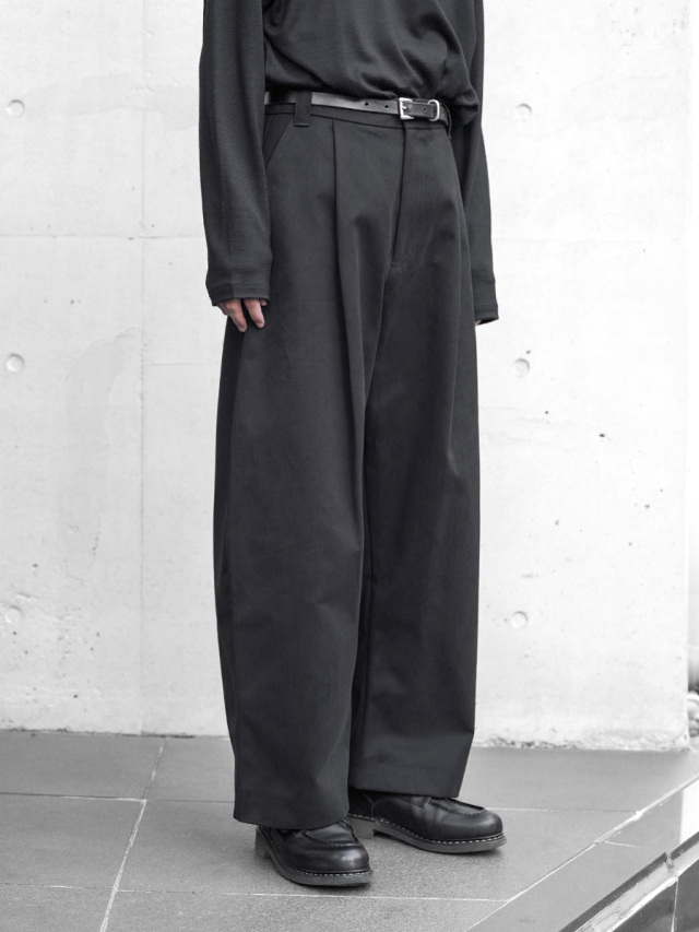 STUDIO NICHOLSONの代表作ボリュームパンツ。ウエストに深くとられたタックが生み出す立体的なシルエットが特徴で、腰回りから裾にかけて緩やかにカーブを描くテーパードラインは非常に美しく仕上げられています。