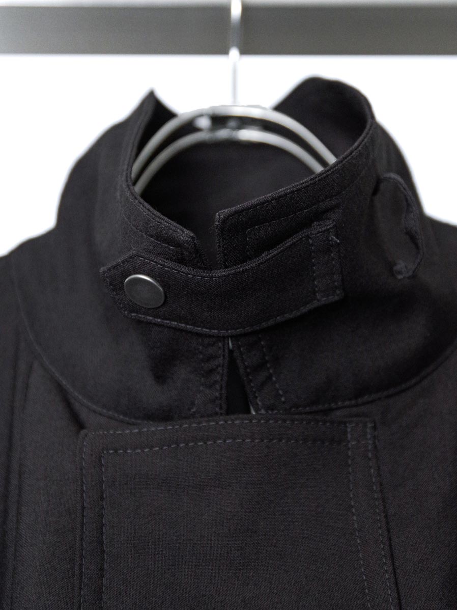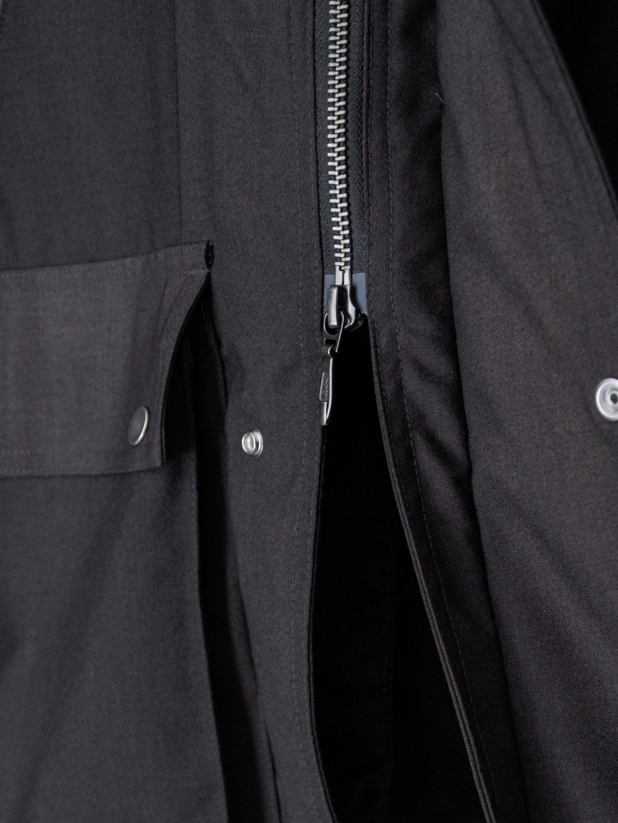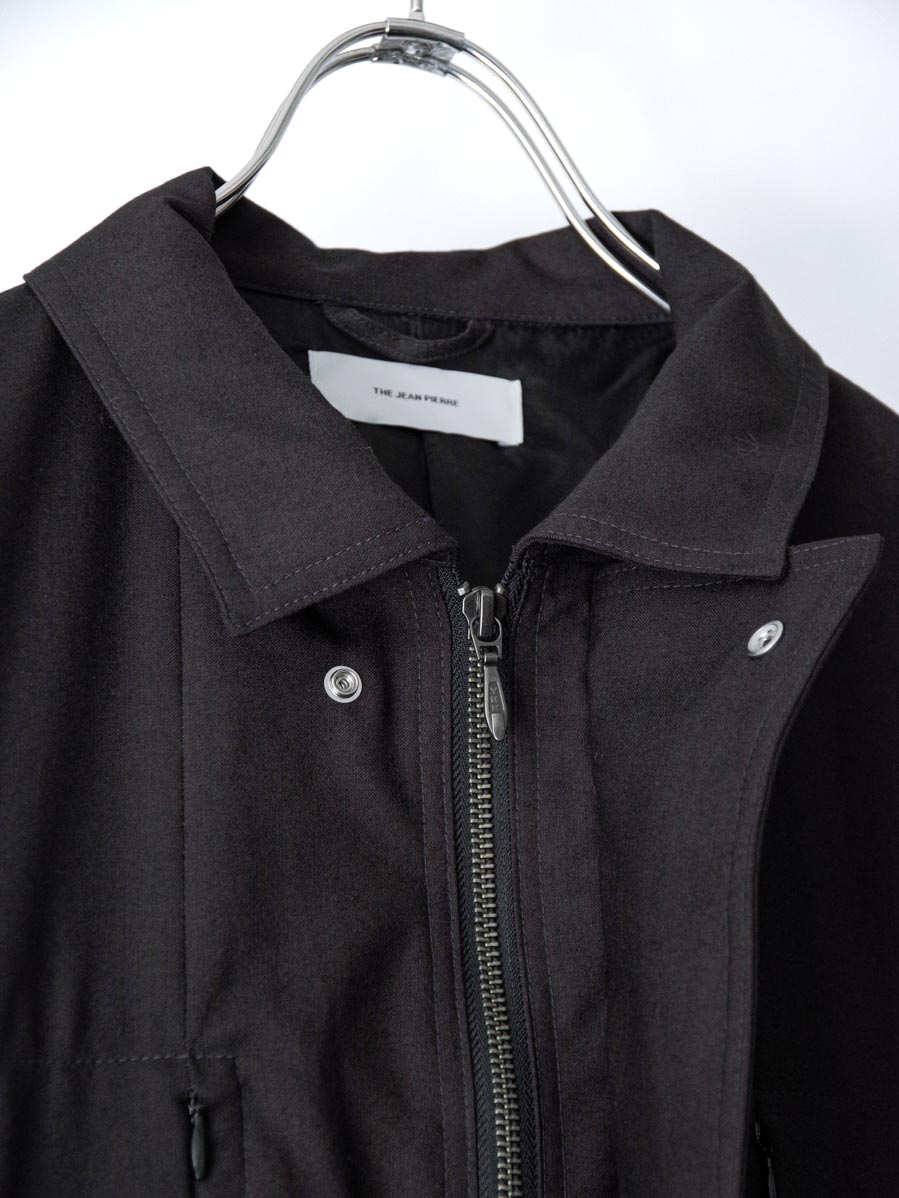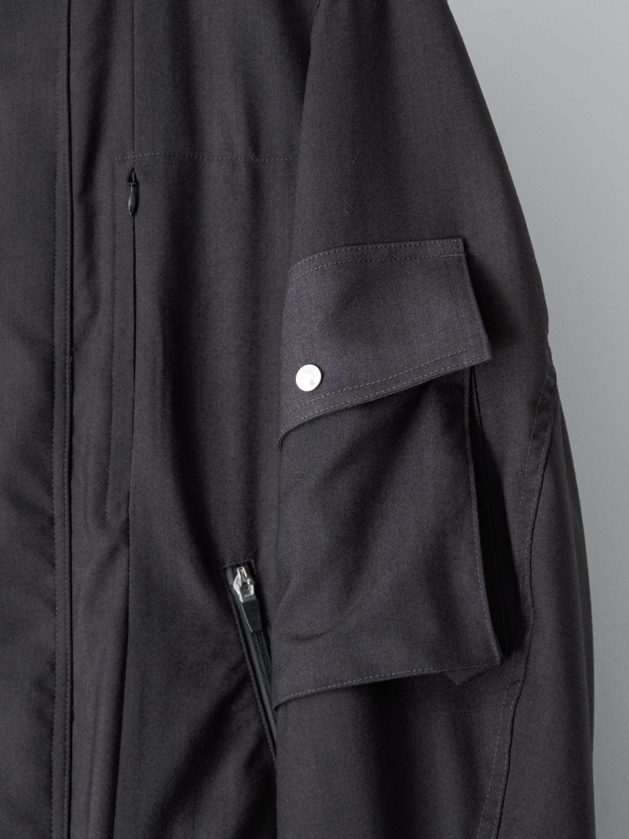 腰元には斜めに配されたジップポケットに加え、フラップ付きのパッチポケットを配置。さらにその脇にはサイドポケットも備え、実用性にも配慮した設計です。襟は立ててスタンドカラーとしても着用でき、スタイリングに応じたアレンジを楽しめます。