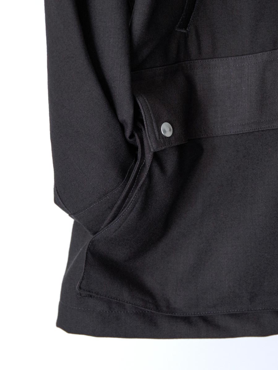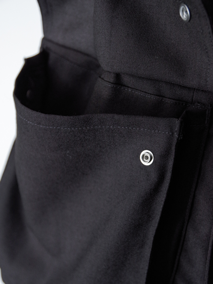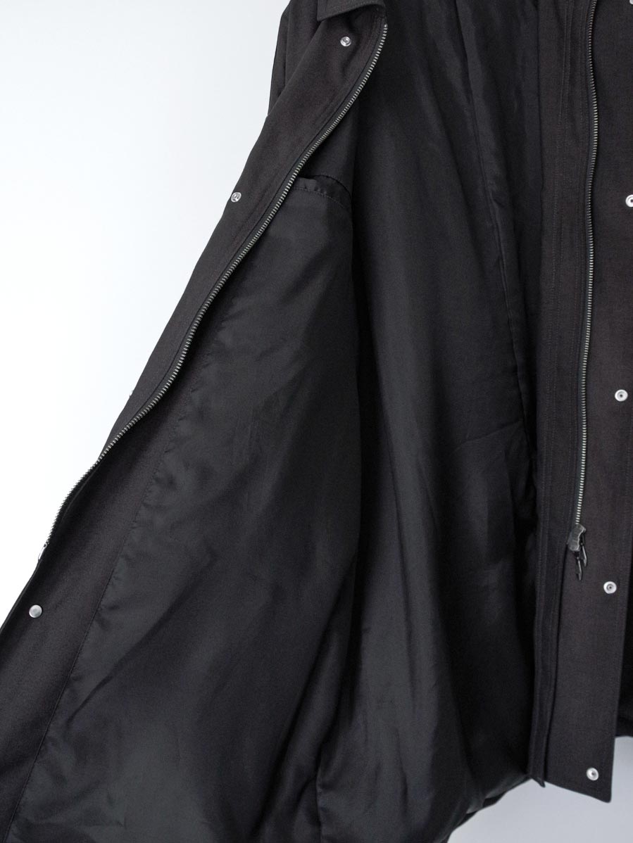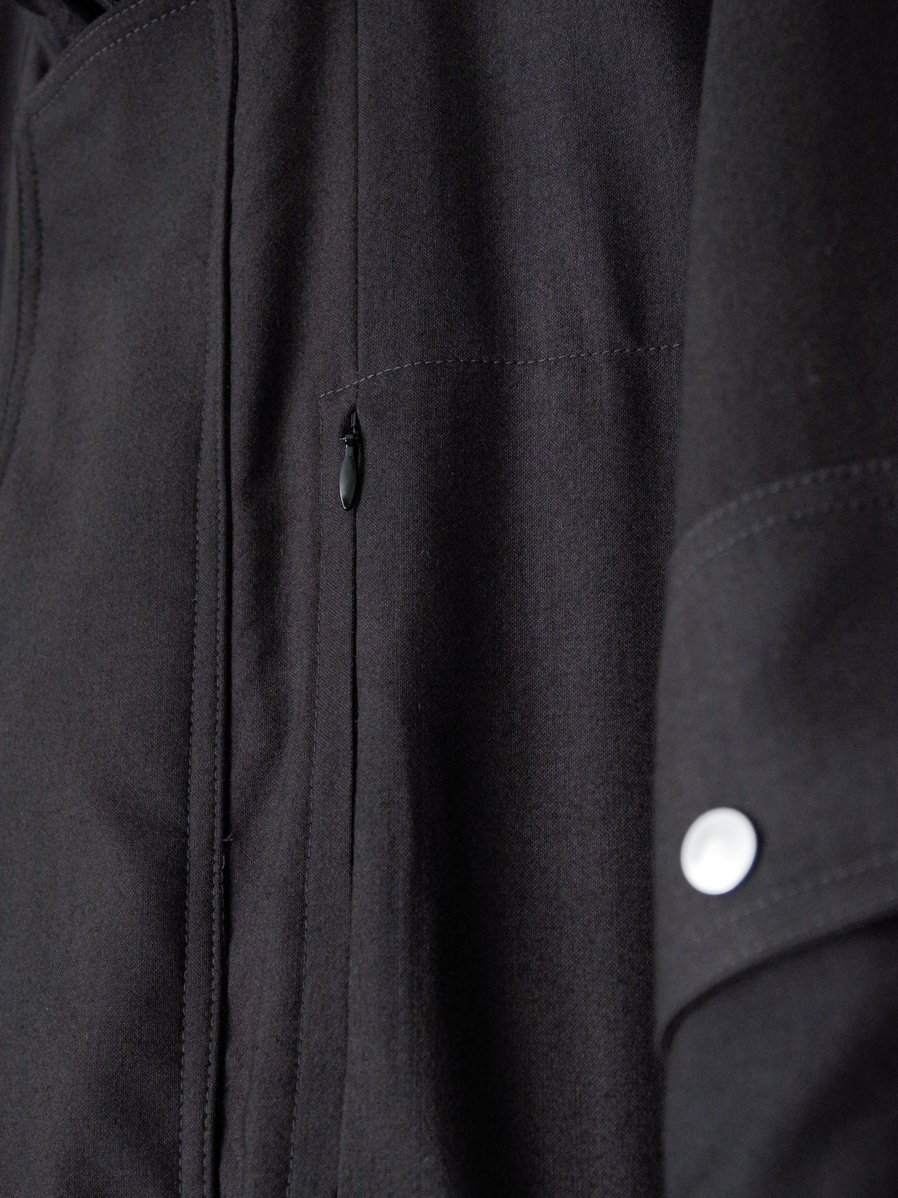 腰元には斜めに配されたジップポケットに加え、フラップ付きのパッチポケットを配置。さらにその脇にはサイドポケットも備え、実用性にも配慮した設計です。襟は立ててスタンドカラーとしても着用でき、スタイリングに応じたアレンジを楽しめます。