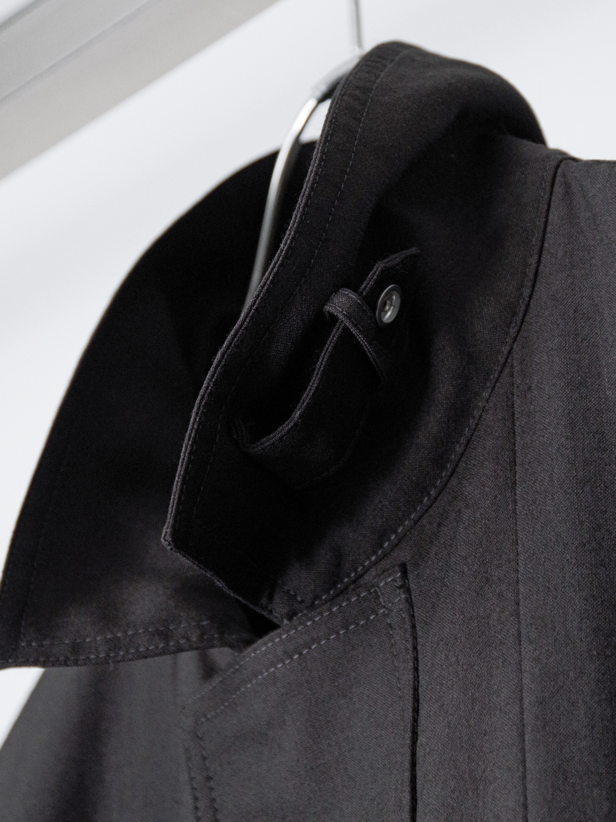 シックでモードな佇まいの中に、流し染めによる表情豊かな奥行きと職人の技術が息づく一着。長く愛用できる汎用性の高さも魅力のアウターです。