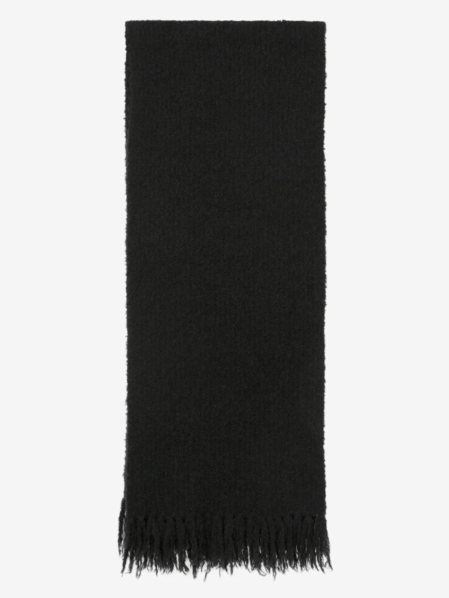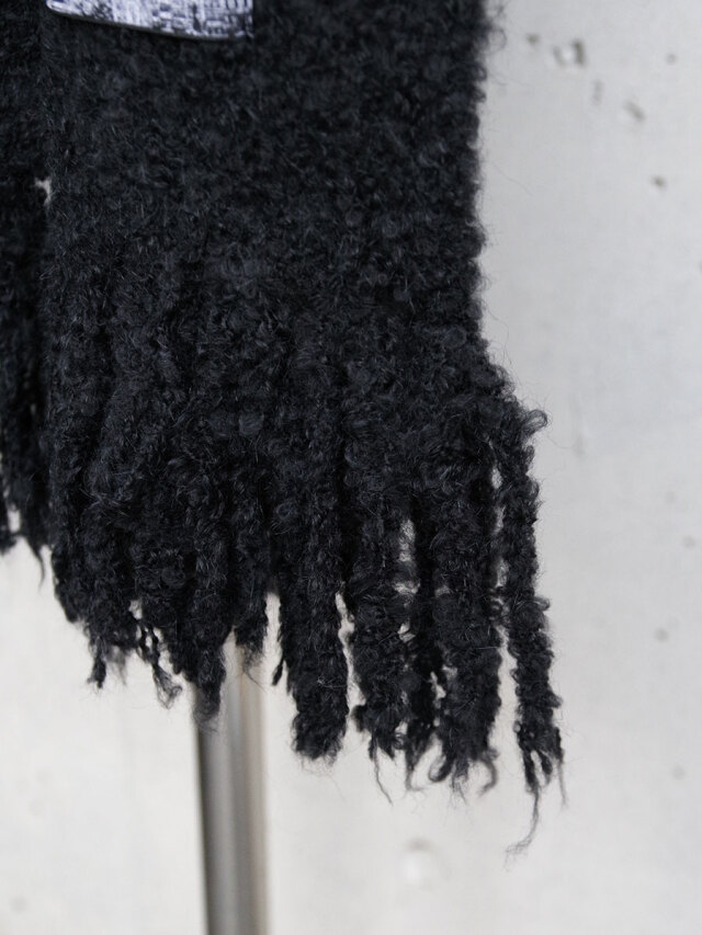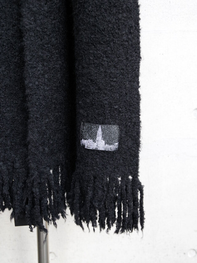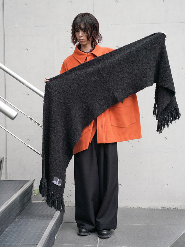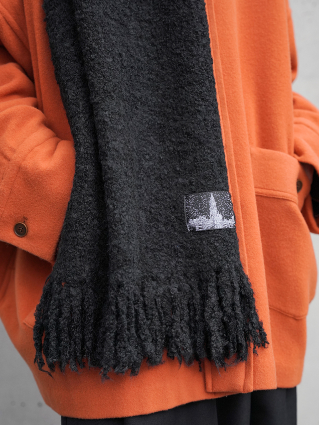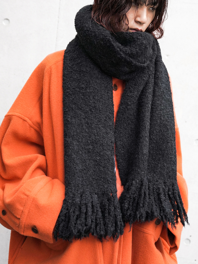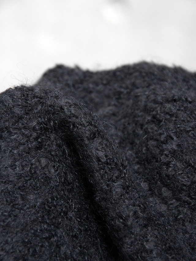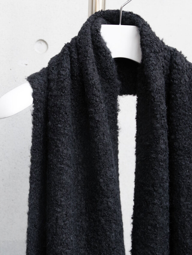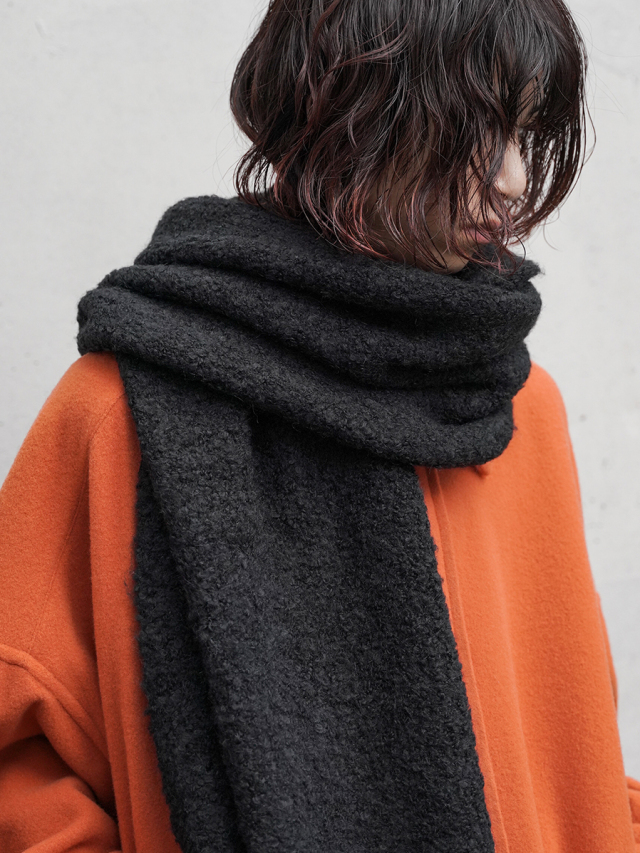 糸はループ状に膨らんだブークレ撚⽷の形状をしており、見た目の重厚感とは裏腹にその巻き心地はとても軽やか。重衣料の多くなる秋冬シーズンにもストレスなく重ね着が楽しめます。