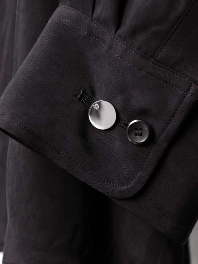 左胸には控えめにブランドロゴの刺繍が施され、左カフスにはメタルパーツがアクセントに。両サイドにはポケットが設けられ、ライトアウターとしての活用も可能です。