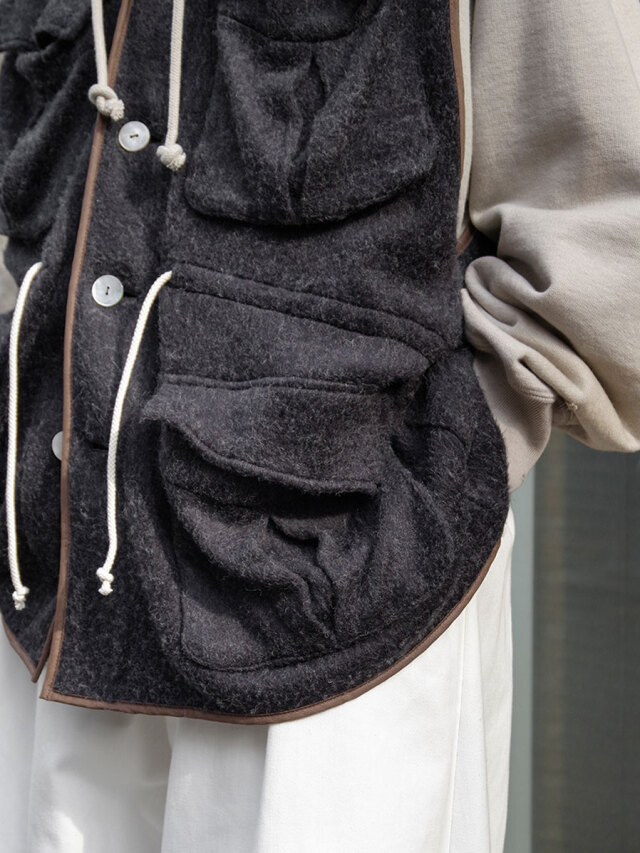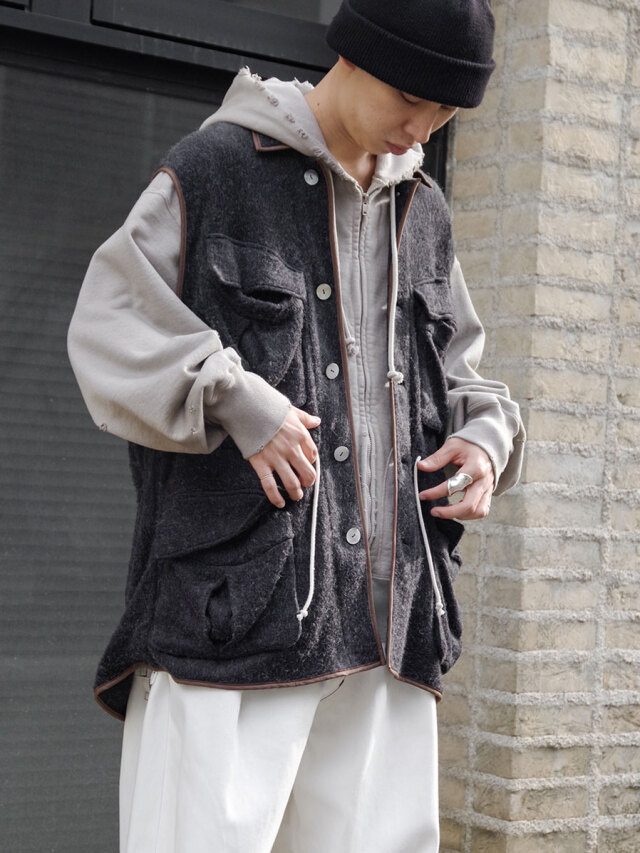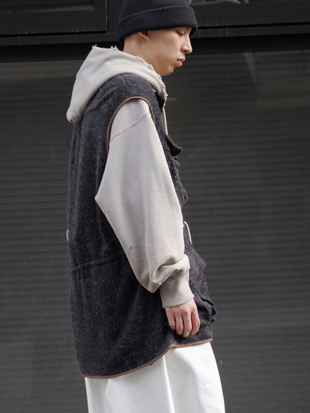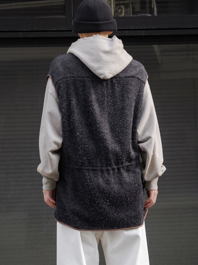 A vest made of shaggy fleece with a drapey feel. The fabric is soft and feels good on the skin, and is lightweight yet highly heat-retaining.