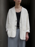 イギリスの伝統的な草花からモチーフを得たヴィクトリアン・チンツ柄のレース生地を採用したカラーレスジャケット。細糸のコットンを中心に組成することで、柔らかく軽やかな生地感となっております。リラックス感のあるシルエットに合った、独特な落ち感と綺麗なレース目によりアンニュイな雰囲気で纏っていただけます。40sブロードの肌触りの良いコットン裏地を使用することで、快適な着用感です。レーザー加工されたシェルボタンを採用。