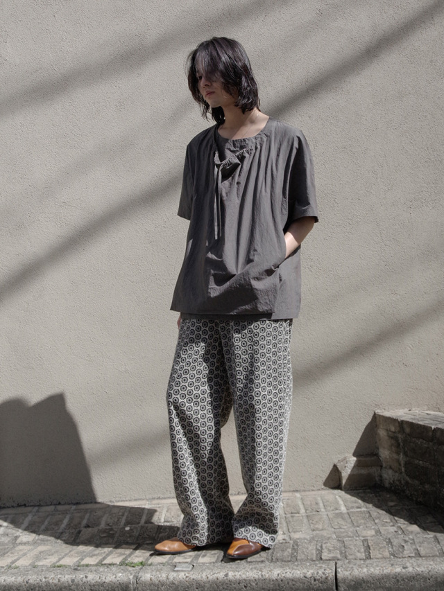 丁寧に打ち込まれた刺繍柄によるアイコニックなデザインで、60番手の細糸で織られたローン生地がベースとなっており、滑らかな肌触りと適度なコシを併せ持つファブリックです。部分的に透かされたレーズ生地のようなルックスであり、ライニングにはコットンリネンの生地を配置しています。下着が透けるなどの心配も無く、肌当たりも良く快適な履き心地をご体感いただけます。