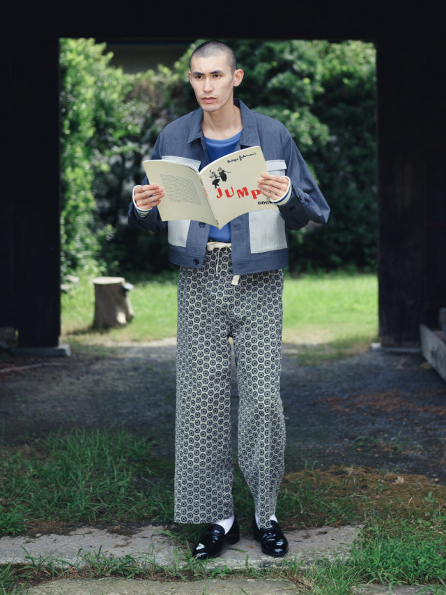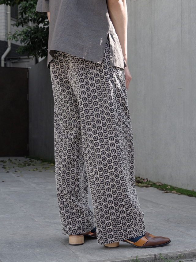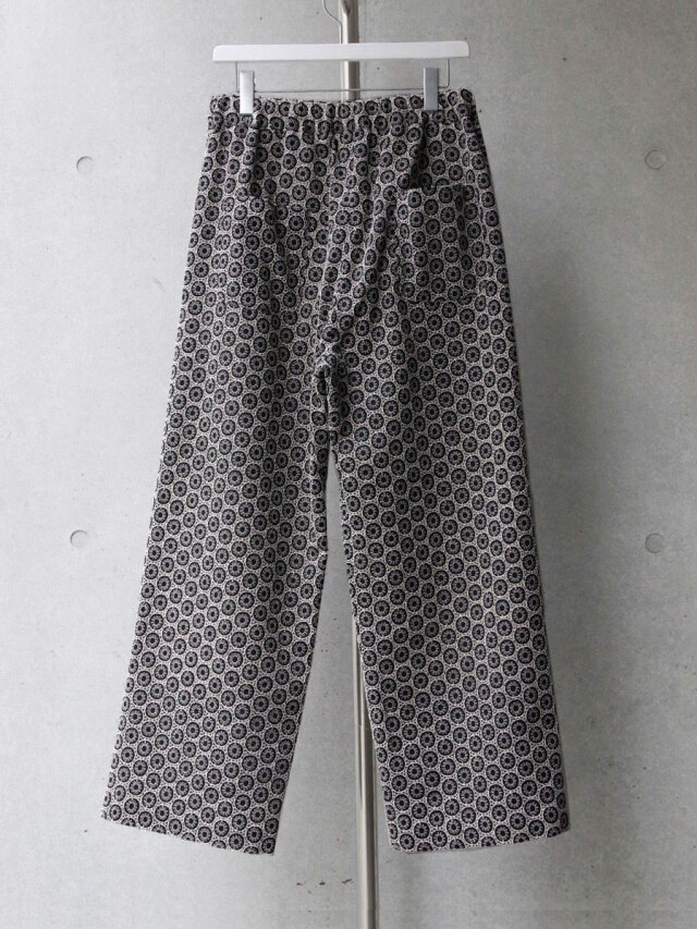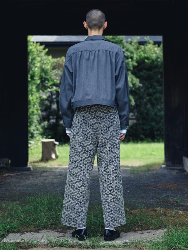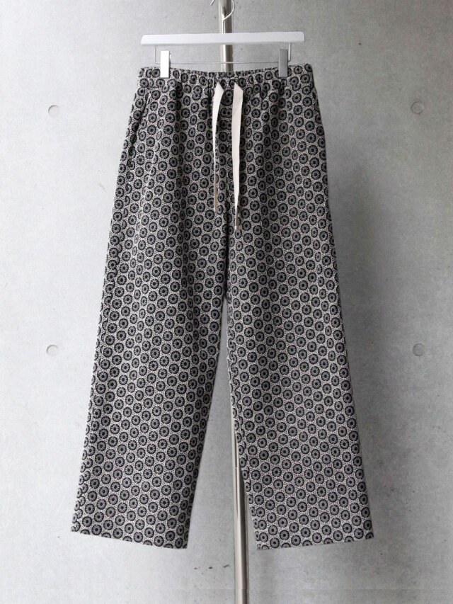 オリジナルで製作した幾何学柄の刺繍を全面に施した生地を採用したフルレングスのイージーパンツ。