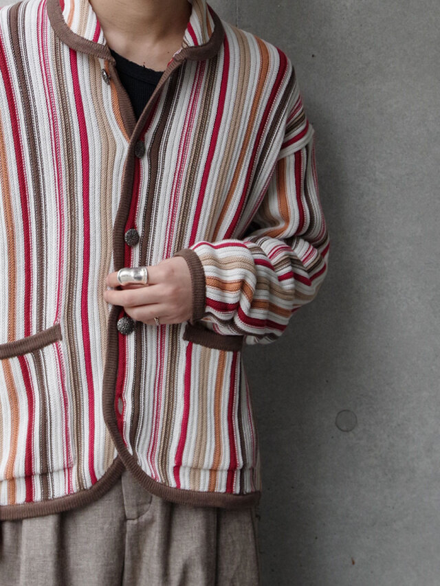 天然素材を掛け合わせた風合い豊かな生地感になっています。オリジナルの横縞ボーダー編地を作成し、角度を変えて縦ストライプとして採用。Cornelia Thomsenの「Stripes」から着想を得た立体感のあるファブリックデザインです。