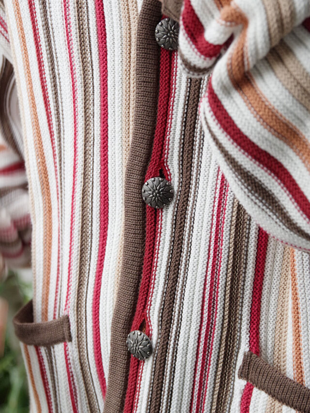 The fabric has a rich texture that combines natural materials. An original horizontal striped border knit was created and angled to create vertical stripes. A three-dimensional fabric design inspired by Cornelia Thomsen's "Stripes."