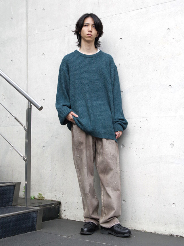 シルエットはゆったりとしたオーバーサイズ仕様。くったりと落ちるニット特有の風合いが加わり、着こなし全体にリラックス感と雰囲気を与えます。首元はやや緩めに仕立てられており、抜け感のある印象を演出。カットソーをレイヤードして胸元にアクセントを加えたり、シャツの襟をのぞかせて遊びを効かせたりと、スタイリングの幅も広がります。