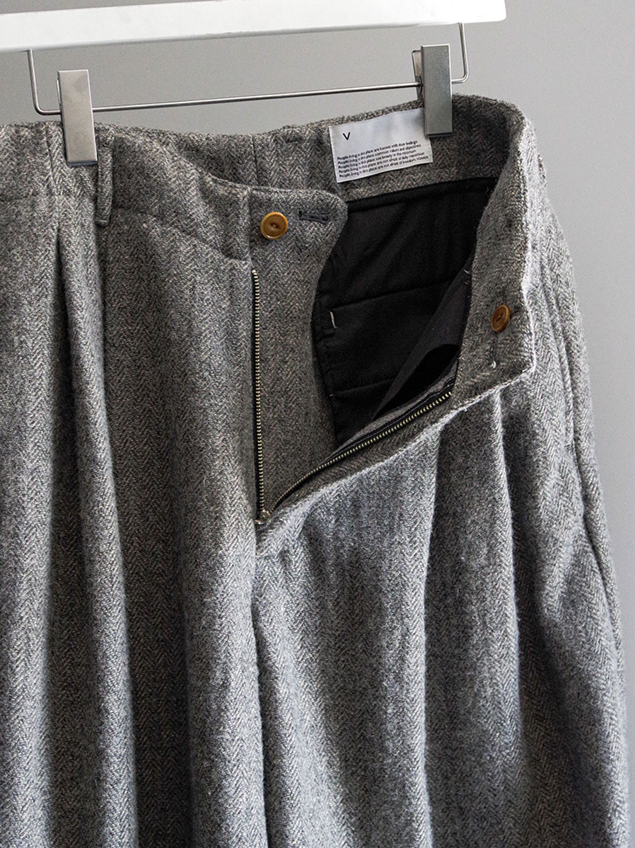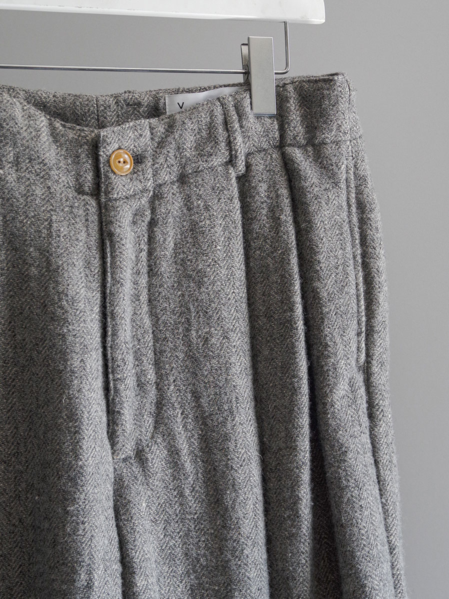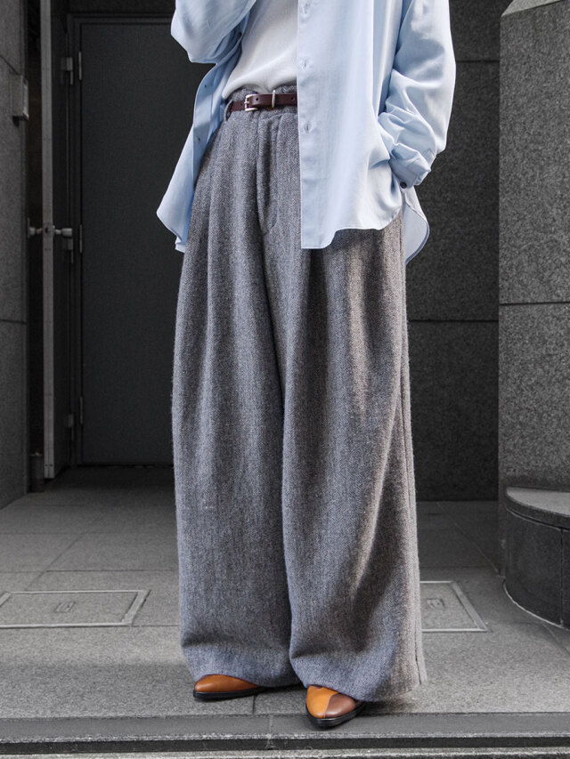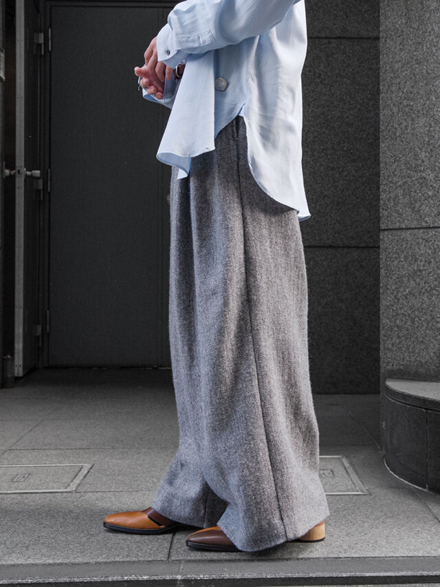 シルエットはしっかりと太さを持たせたワイドストレートで、腰元にタックを入れることで立体感を加え、上品ながらもリラックスした雰囲気を演出します。