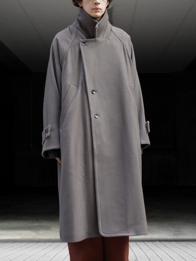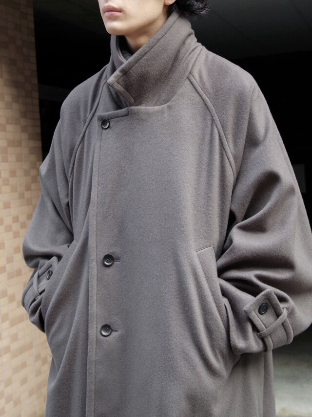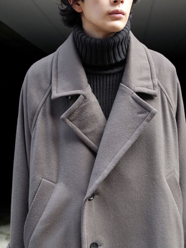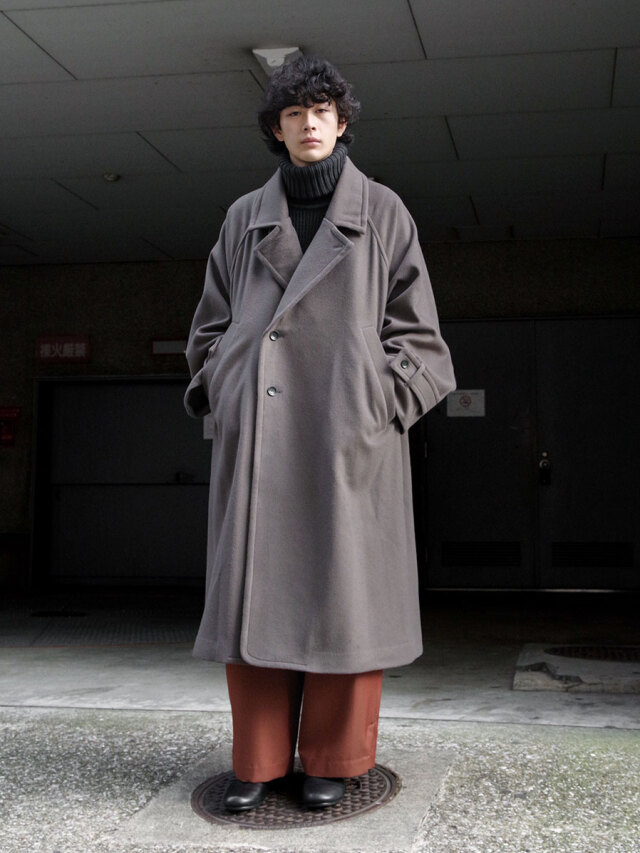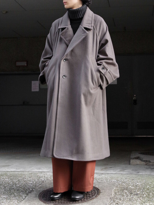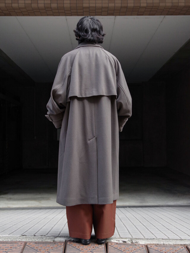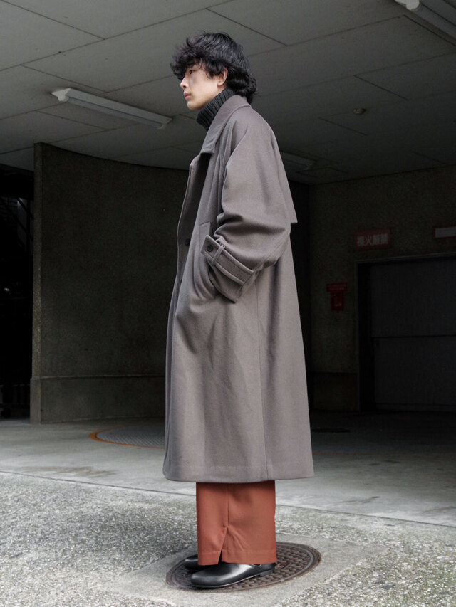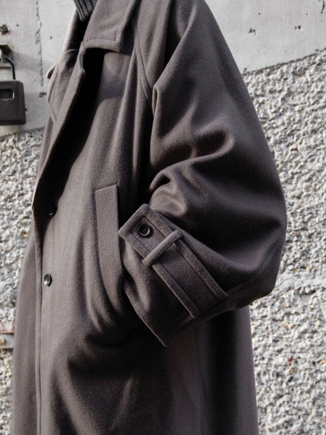 その柔らかな素材感は、ポケットに手を入れたり、腕を組んでみたりといった日常の動作の中でも魅力的な表情を見せます。カフスベルトで袖口を絞ればアームのラインにも立体感のあるドレープが形成され、機能面で言えば冷たい風の侵入を防いでくれます。