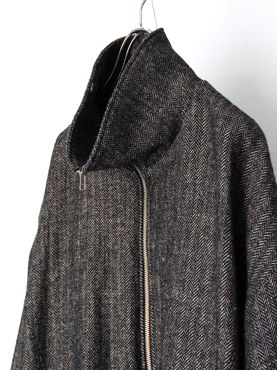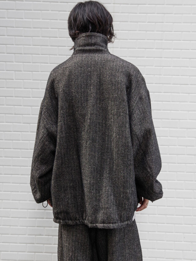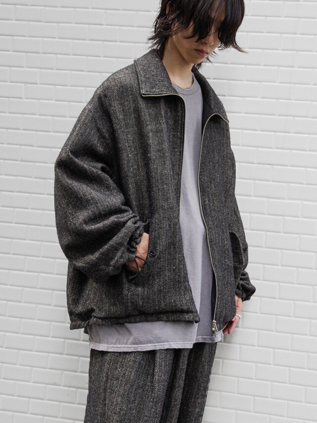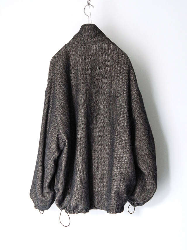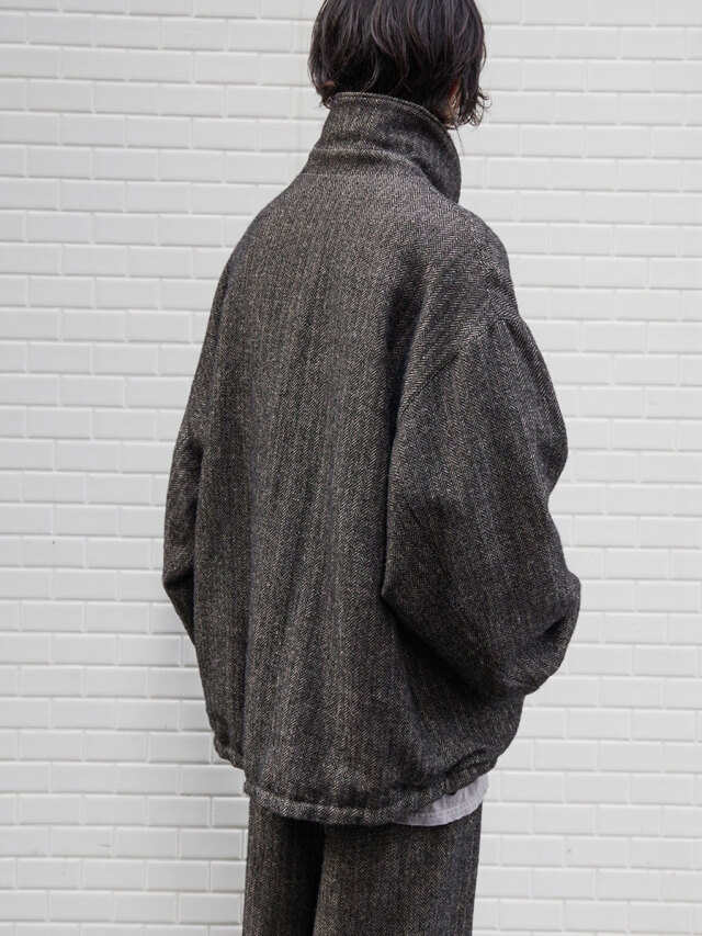 A zip-up blouson crafted from a herringbone fabric woven with melange wool for the warp and linen for the weft.