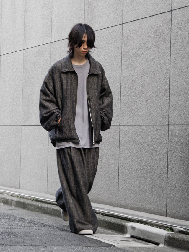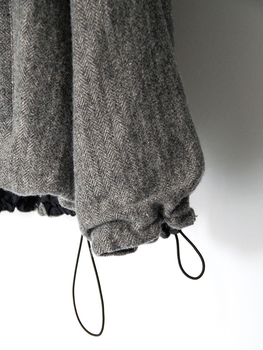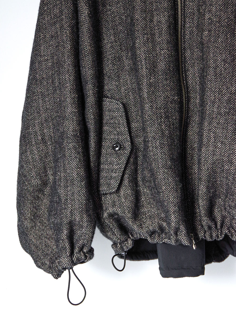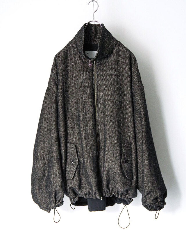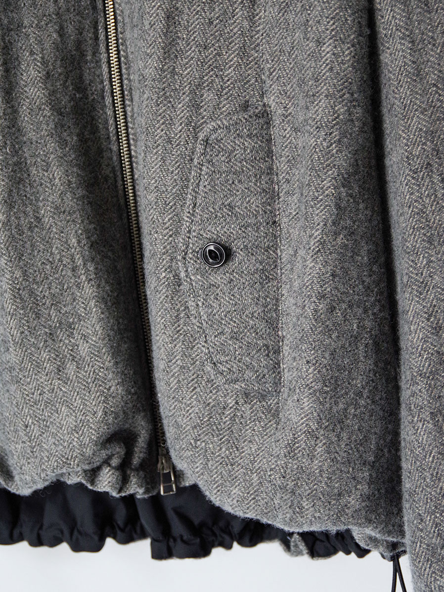 A zip-up blouson crafted from a herringbone fabric woven with melange wool for the warp and linen for the weft.