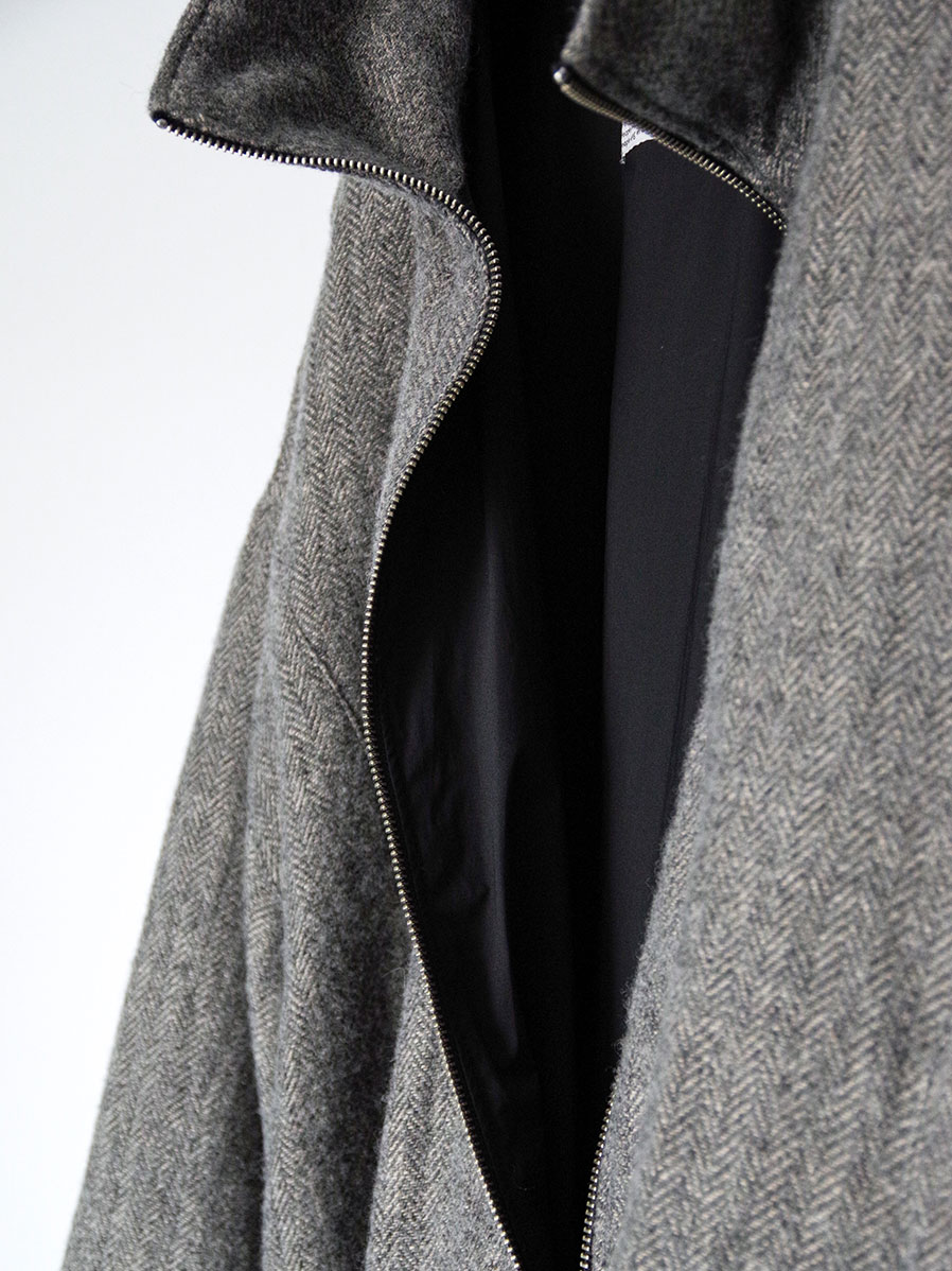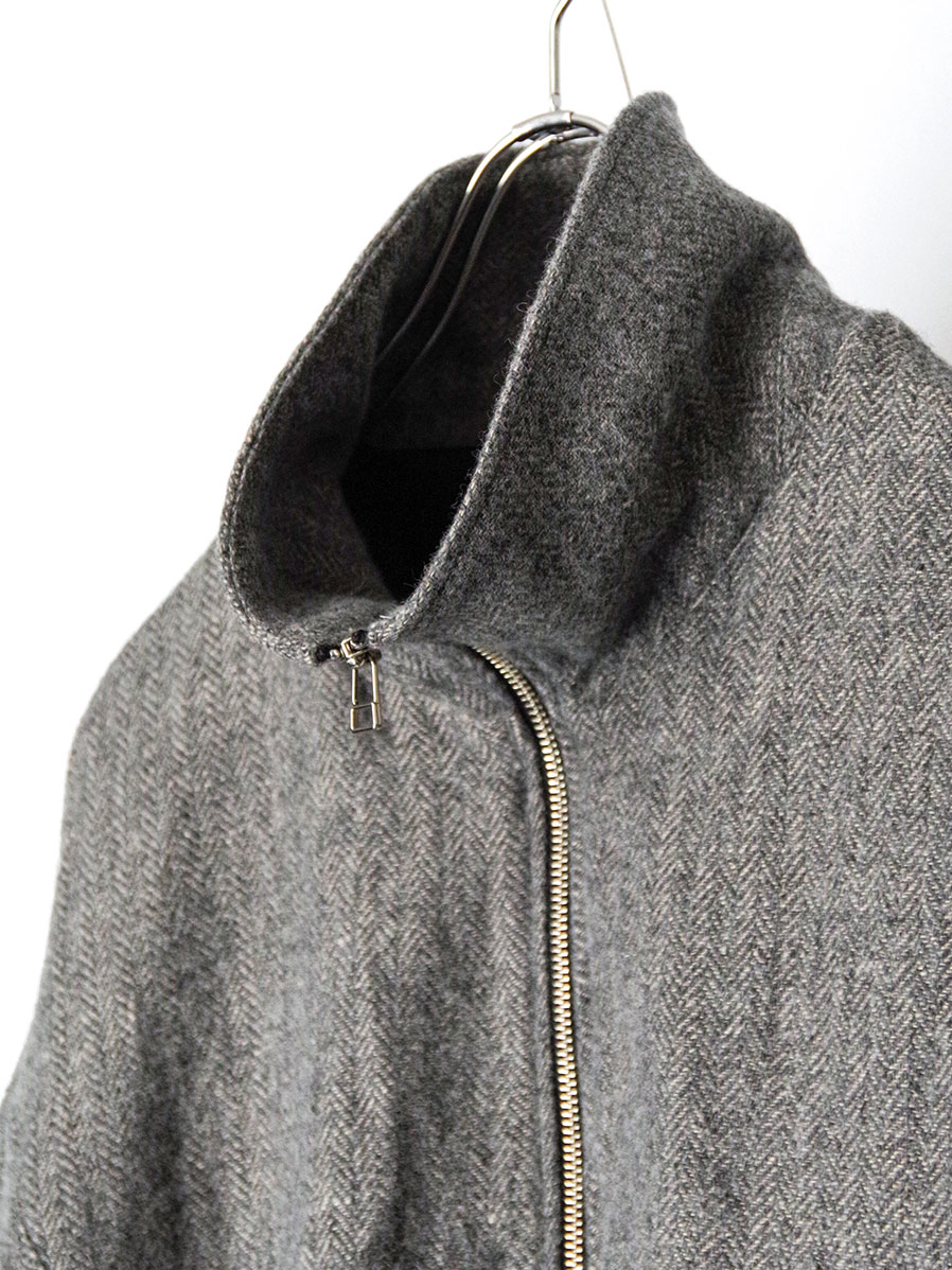 メランジウールをタテ糸に、リネンをヨコ糸に用いたヘリンボーン生地で仕立てたジップアップブルゾン。