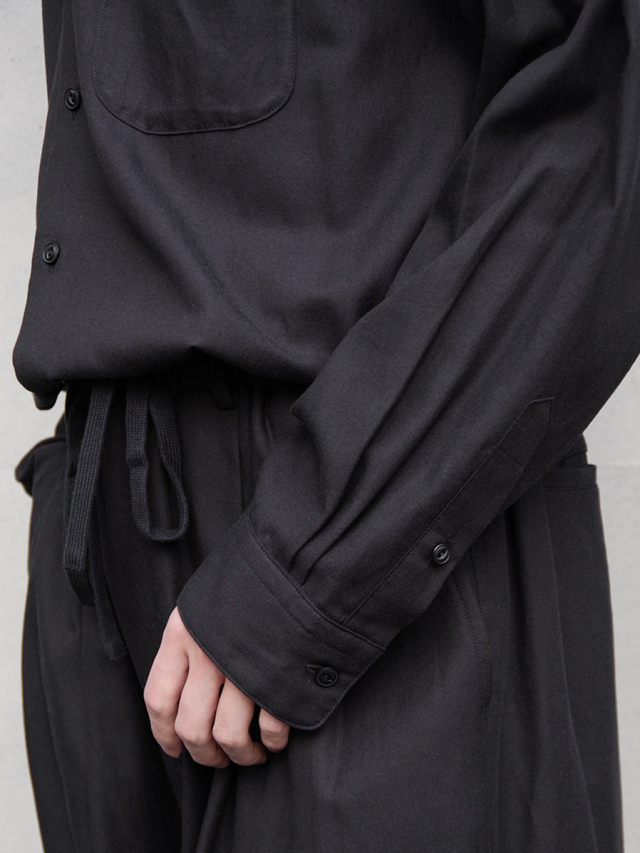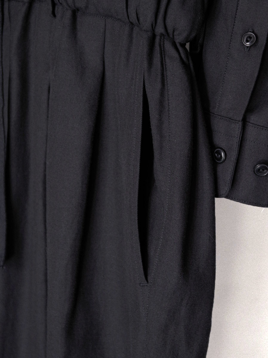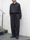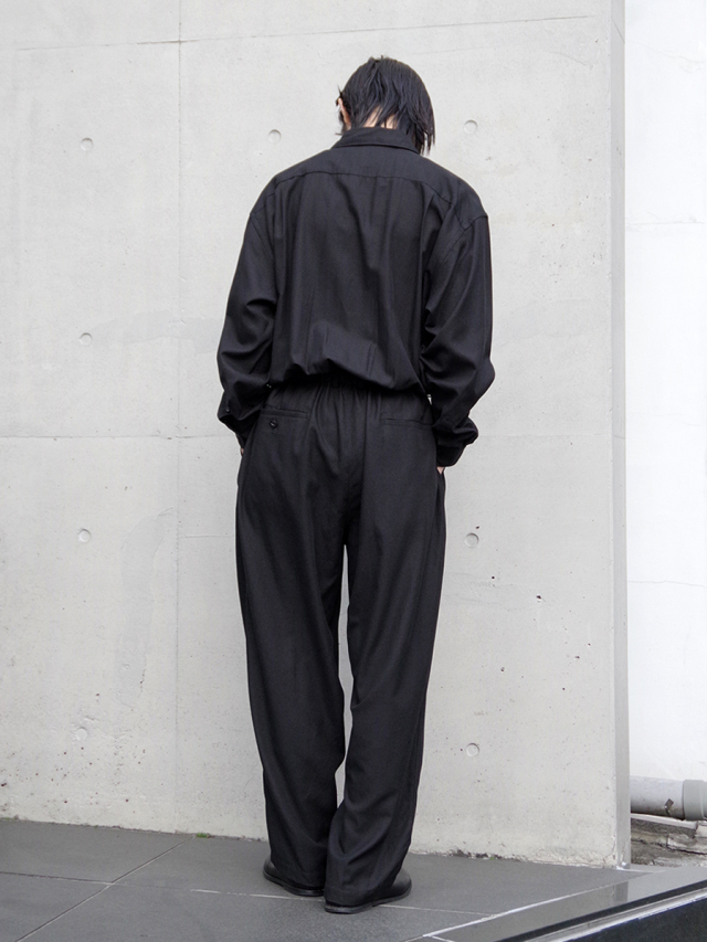 ドレスシャツとスラックスを一体化させたような構成で、これ一着でスタイリングが完結する利便性も大きな魅力です。単体での着用はもちろん、アウターを重ねてもバランスが取りやすく、シーズンを問わず活躍します。