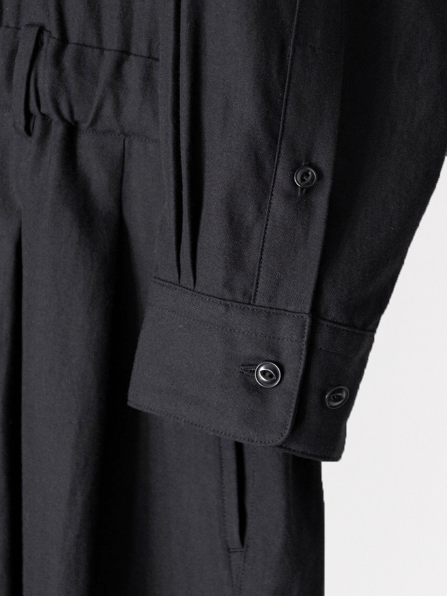 Designed as if a dress shirt and slacks were seamlessly combined, the jumpsuit offers the convenience of a complete outfit in a single garment. It works effortlessly on its own or layered under outerwear, making it suitable for year-round wear.