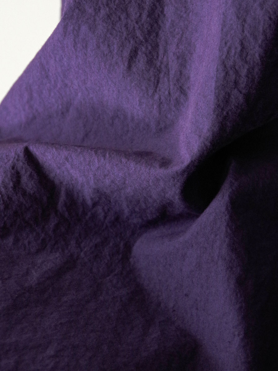他の機屋では再現が難しい限界まで高密度に織り上げた平織生地で、細番手の糸を極限まで詰めることで、動くたびに甲高い布ズレ音を奏でます。パリパリとした独特の音と張り感が、まるで布そのものを纏っているかのような感覚をもたらします。