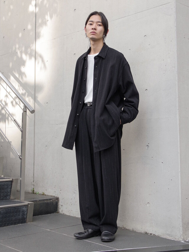 The fabric is an original textile woven in the historic Bishu region on vintage looms. Crafted from a blend of cashmere-mixed wool yarns and cotton yarns spun from carefully selected raw materials, it delivers a refined and modern suiting expression. The stripe pattern is created using a mix of light gray TOP yarns and kasuri-dyed yarns, a traditional Japanese technique, resulting in irregular, fading lines that evoke a sense of delicacy and depth. A piece that balances relaxation with sophistication, embodying both comfort and quiet elegance.