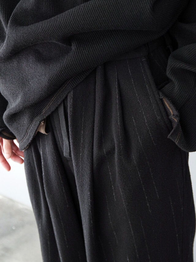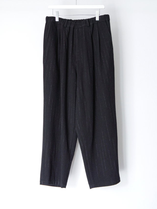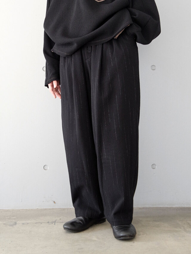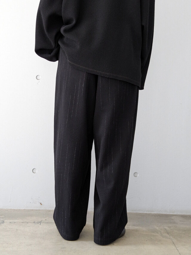 ウエスト一周にゴムを配し、2タックを入れることで程よいゆとりを持たせたワイドイージーパンツ。腰周りはリラックス感がありながらも、裾にかけてスッキリと整えられたシルエットが特徴です。