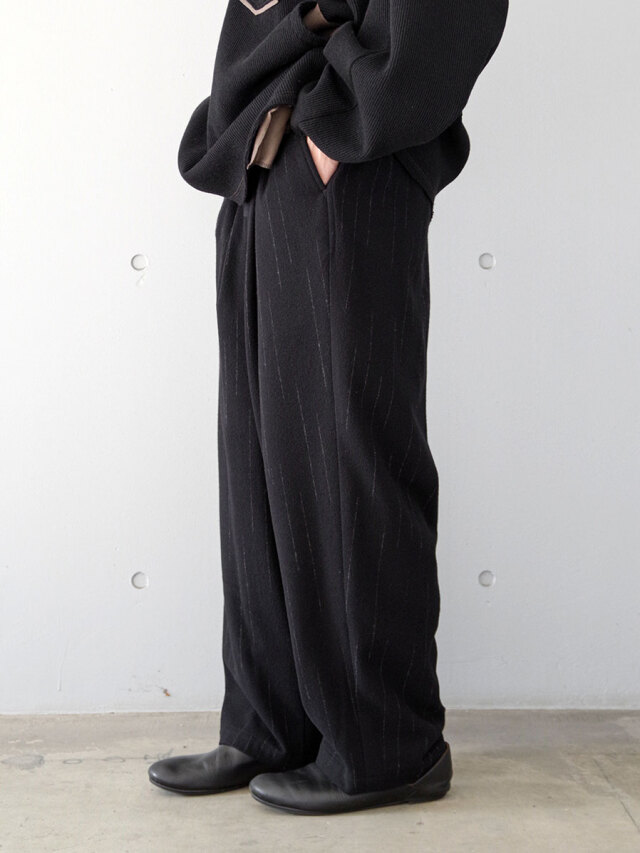 スタイリングを選ばず、カジュアルから上品な装いまで幅広く対応できる、非常に汎用性の高い一本。イージーパンツでありながら、まるでドレススラックスのような気品を備えたルックスに仕上がっています。