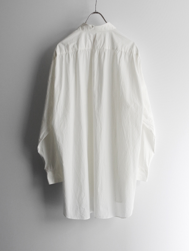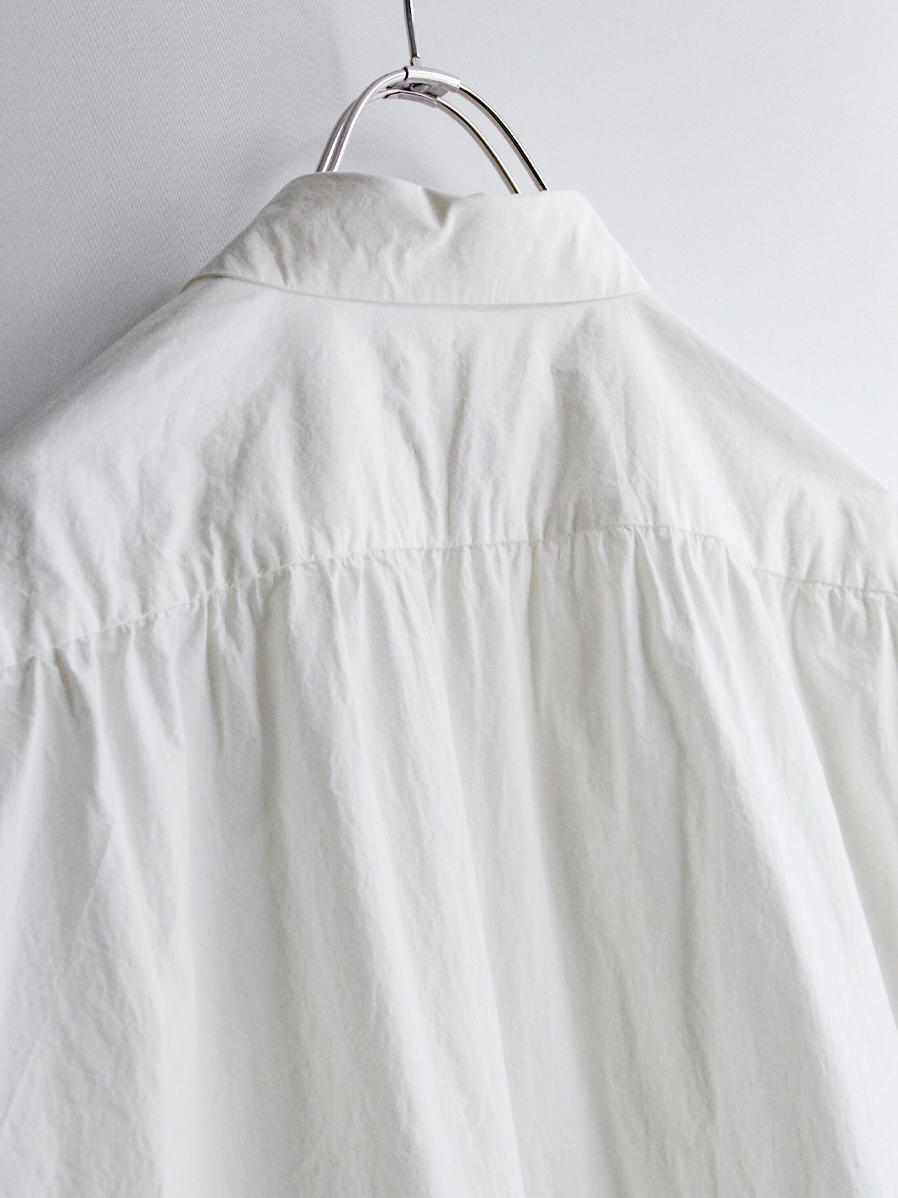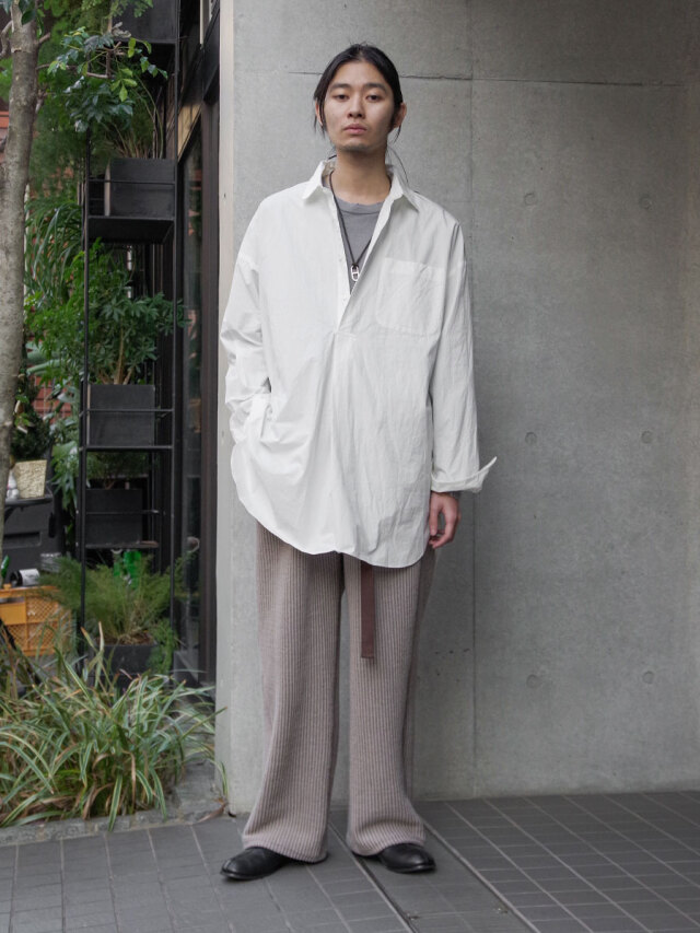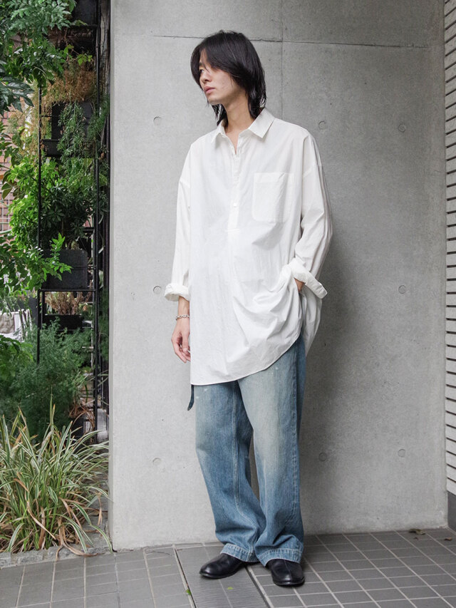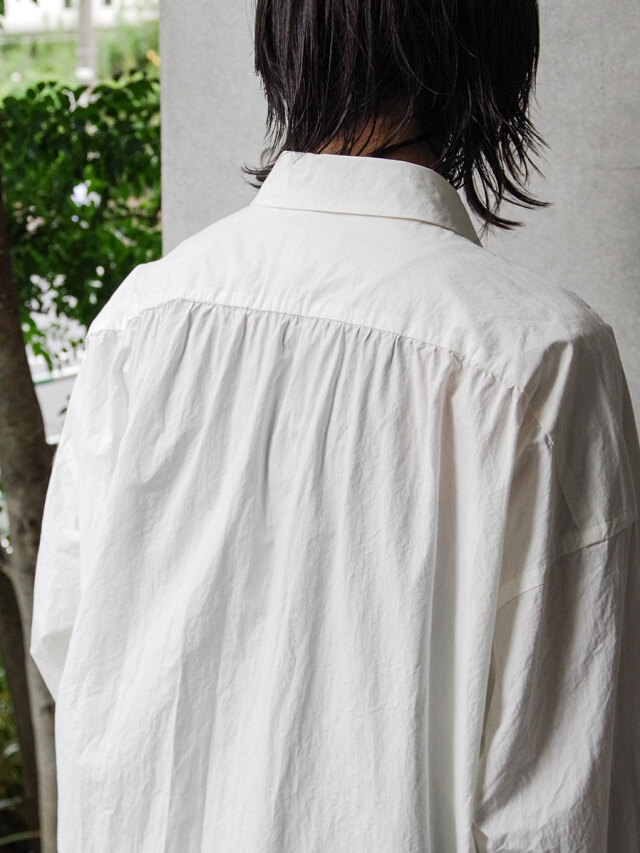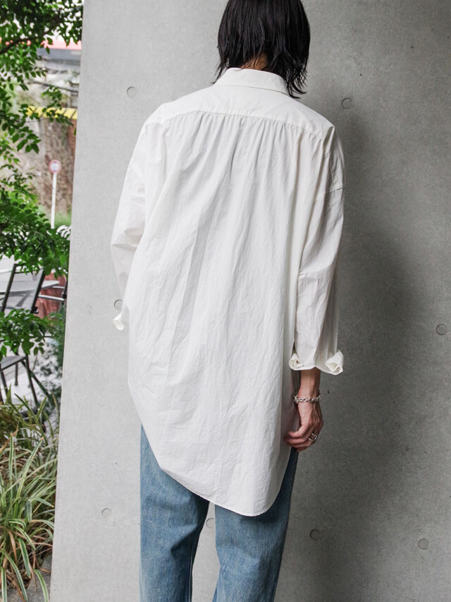 ドレスシャツのような端正で上品なパターンメイキングでありながら、程よくドロップしたショルダーラインとゆったり広い身幅が生み出す、力の抜けたルーズシルエットが特徴です。縫製も非常に丁寧で、どこか凛とした佇まいを漂わせます。レイヤードスタイルにも取り入れやすく、オールシーズン着用できる汎用性の高さも魅力のひとつです。