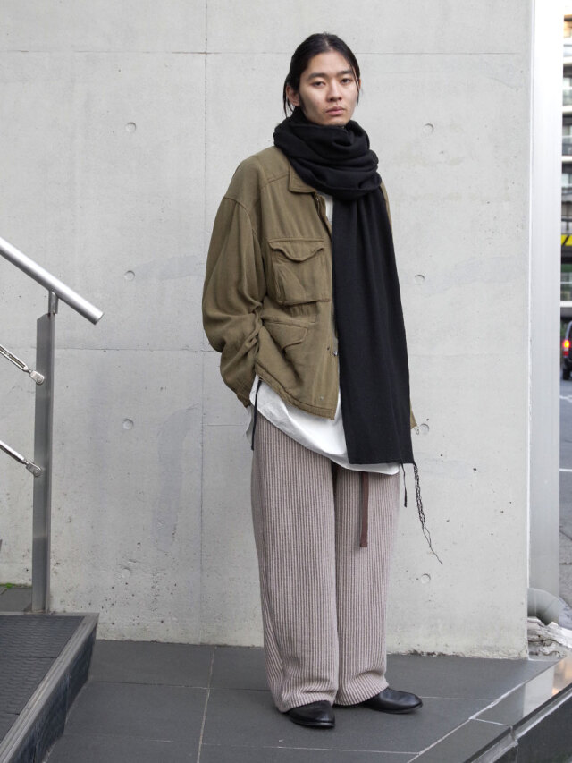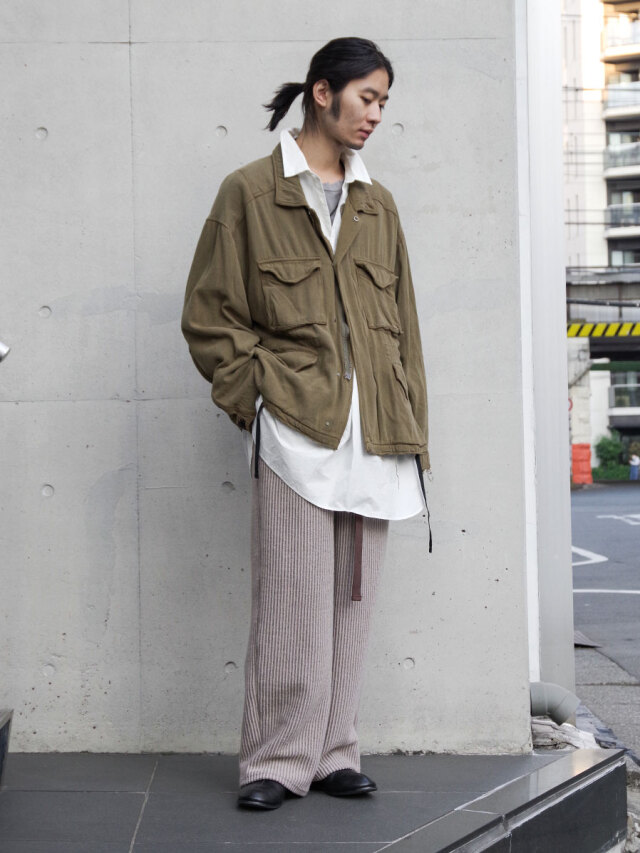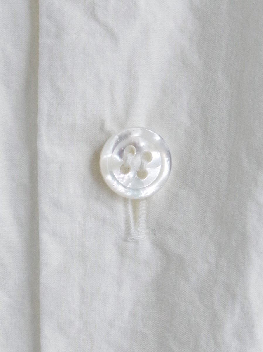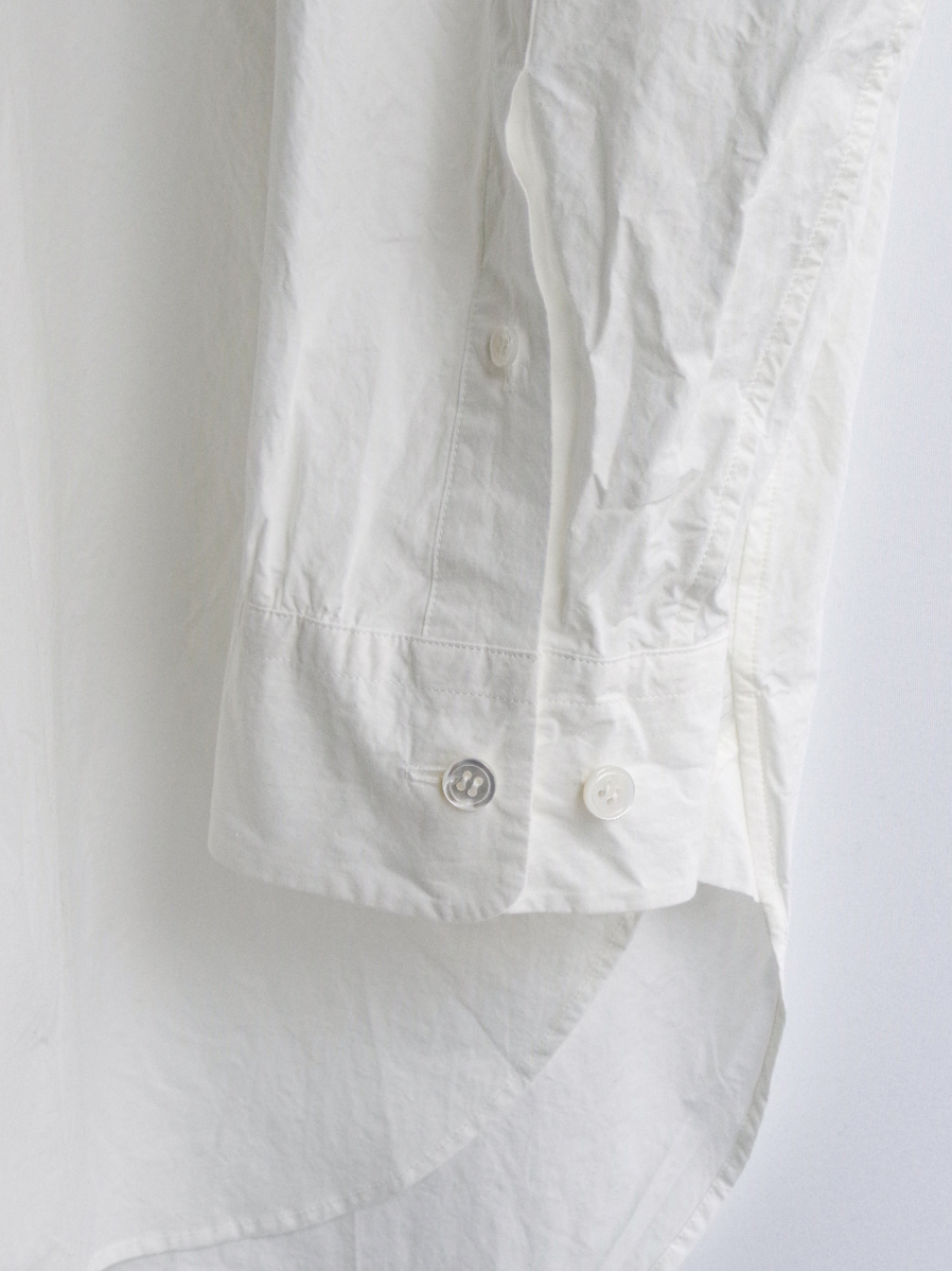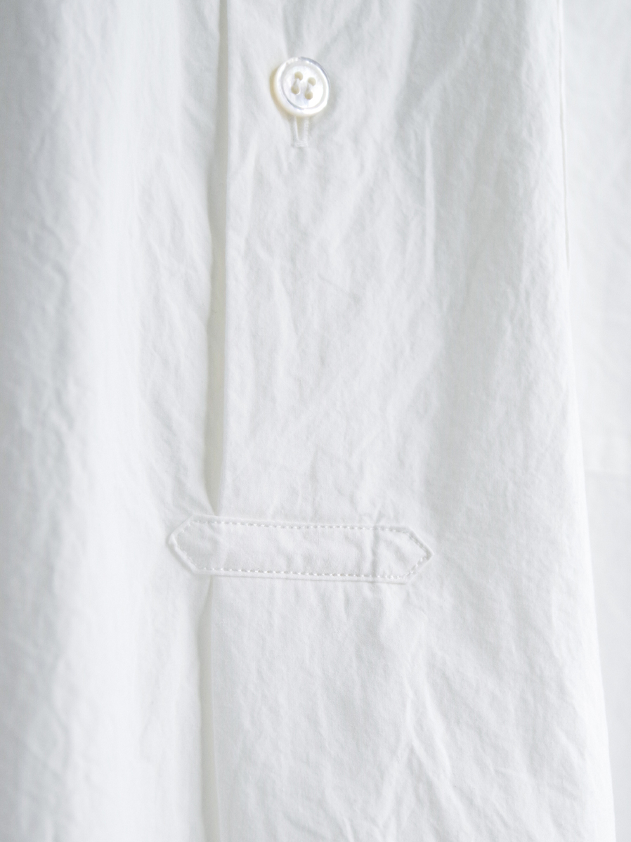 ドレスシャツのような端正で上品なパターンメイキングでありながら、程よくドロップしたショルダーラインとゆったり広い身幅が生み出す、力の抜けたルーズシルエットが特徴です。縫製も非常に丁寧で、どこか凛とした佇まいを漂わせます。レイヤードスタイルにも取り入れやすく、オールシーズン着用できる汎用性の高さも魅力のひとつです。