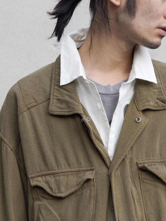 縫製後に製品染め(ガーメントダイ)を施すことで、色合いと風合いに奥行きを加え、着込むほどに独特な経年変化が楽しめる一着に仕上げています。日常着としての実用性と、素材の個性を存分に味わえる一枚です。