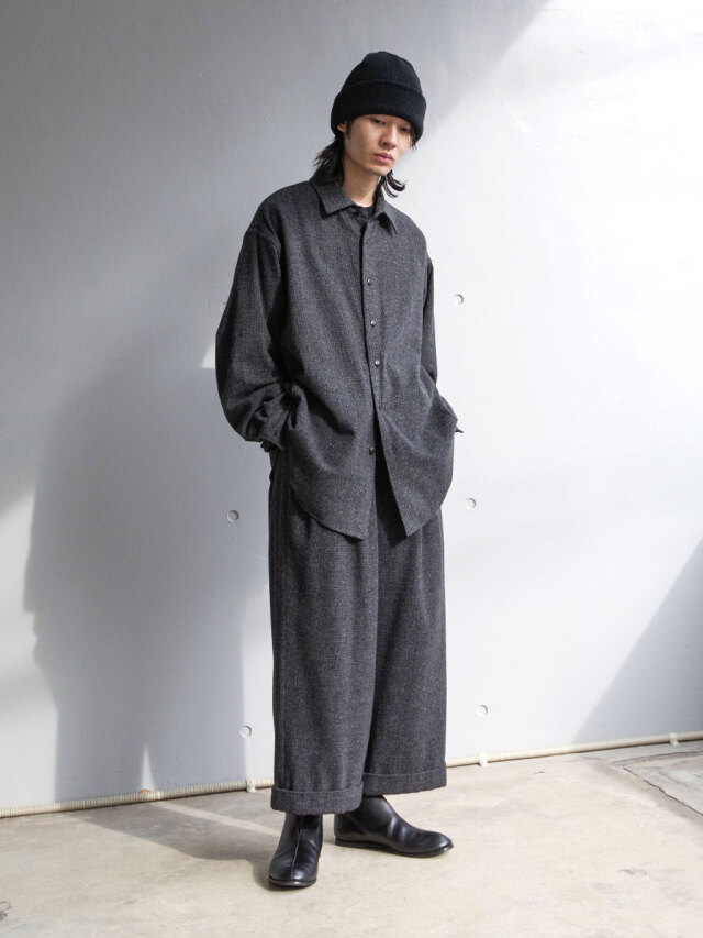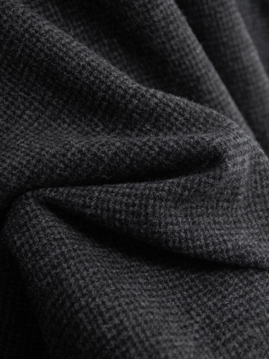 The fabric is an original suiting cloth woven on vintage looms at a historic mill in Japan’s Bishu region. Made from cashmere-blend wool yarns, it offers a soft, refined touch with a graceful drape.
