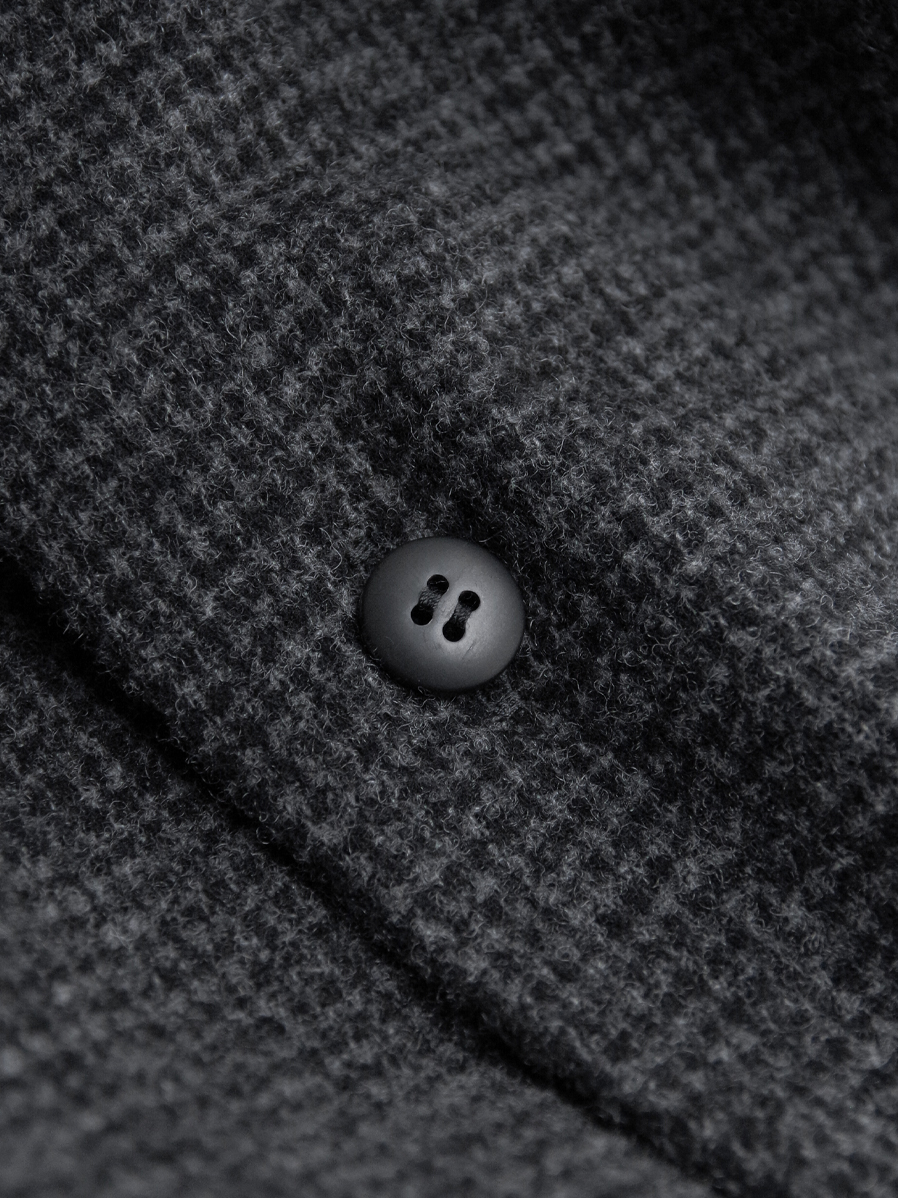 The classic houndstooth pattern is expressed by twisting cotton-dyed yarns around wool TOP yarns. While rooted in traditional design, the pattern has been intentionally disrupted and uniquely twisted, resulting in a fabric that blends heritage craftsmanship with a modern sensibility.