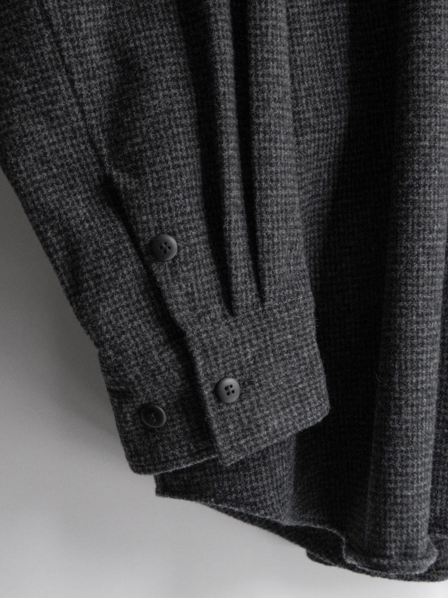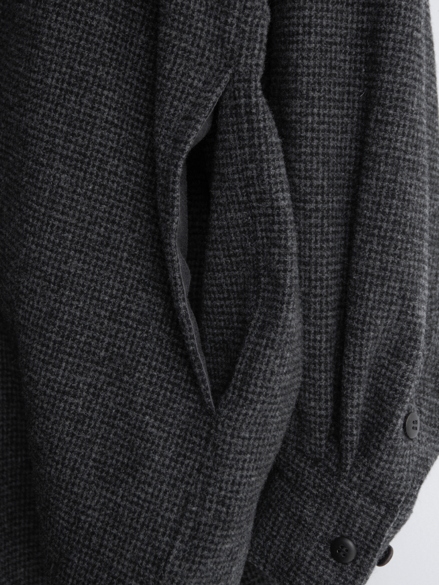クラシックな千鳥格子柄は、ウールのTOP糸にコットンの染糸を撚り合わせることで表現。伝統的な柄をベースにしながら、あえてパターンをわずかに崩し、独自の撚りを加えることで、クラシックとモダンが交差する表情を見事に表現した一着です。