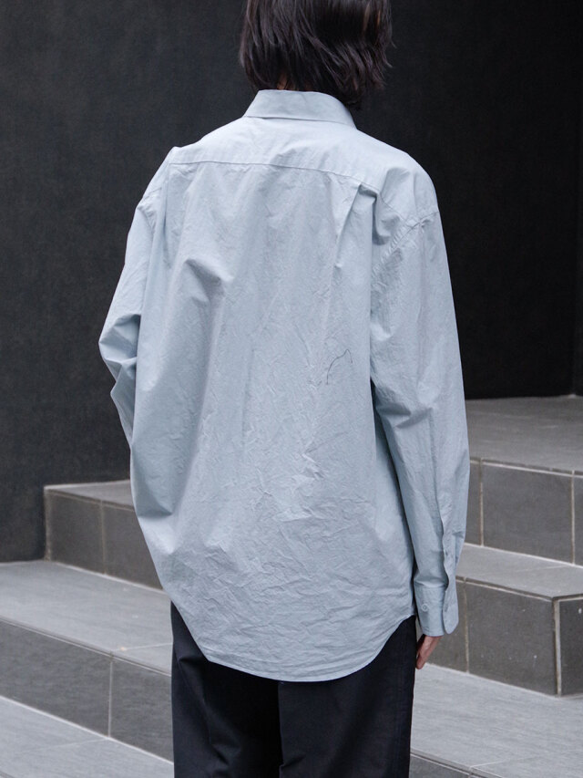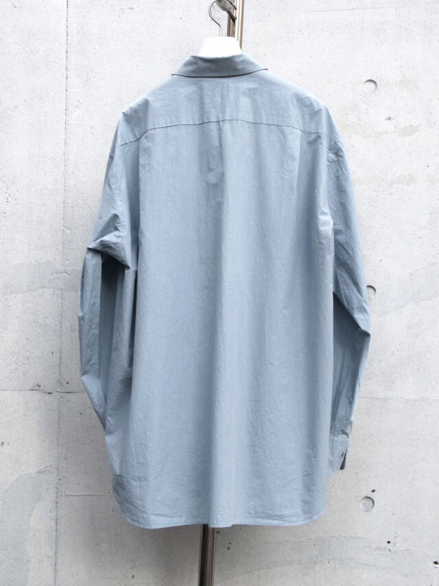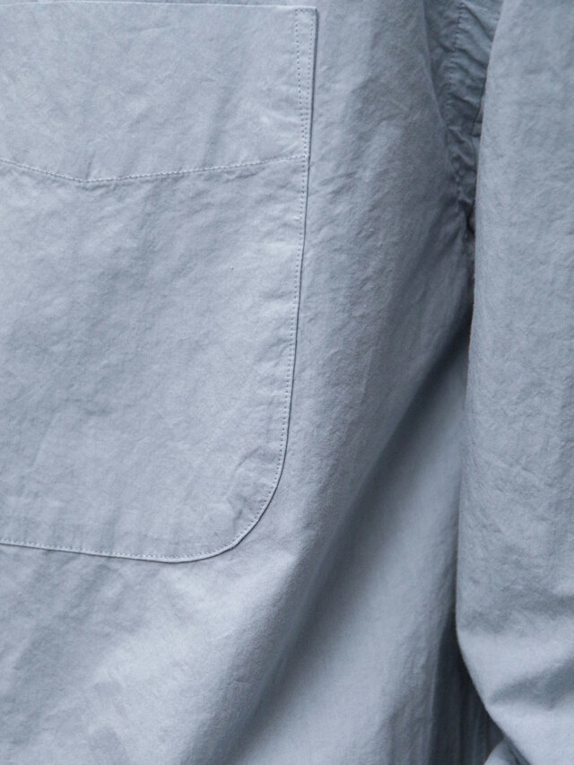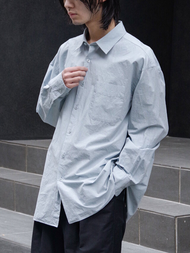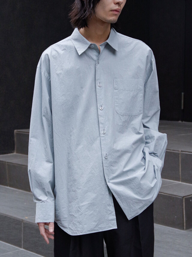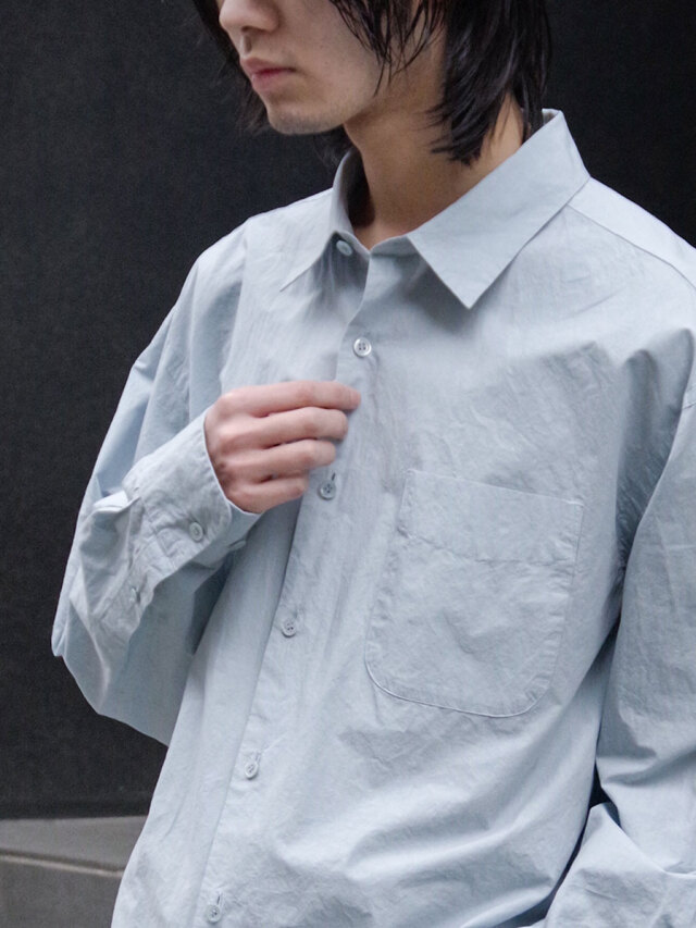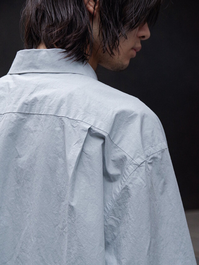 ドレスシャツらしい上品なパターンメイキングで有りながら、程よくドロップしたショルダーライン、ゆったりと広い身幅、力の抜けたルーズなサイズ感が特徴。