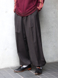 "道着とスラックスパンツをミックスさせた2タック極太カンフースラックス。2タックの普遍的なスタイル。一本持っておけば、とにかくコーディネイトに困らないパンツが欲しくて作りました。ウエストゴムが入っているので、幅広いサイズ感に対応可能。オールシーズン着用出来る軽い仕立て。ベルトループ、ヒップポケット、ウエスト紐付き。裾にボタンがあり、サイズ調節が可能。"