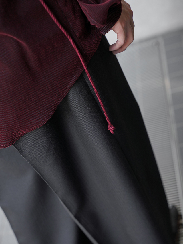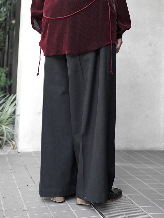 袴の様な上品なドレープが際立つ極太なワイドシルエット。どんな服装、スタイルにも合わせ易い汎用性の高いパンツです。