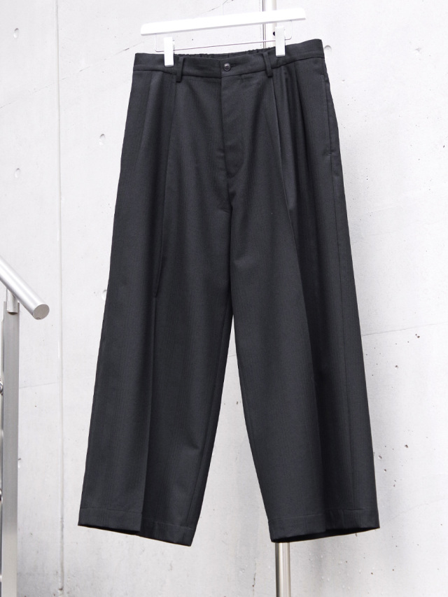 Classic baggy trousers with two tucks in the front and an elastic waistband in the back. A thick wide silhouette with an elegant hakama-like drape. These are highly versatile pants that are easy to match with any outfit or style.