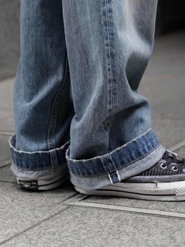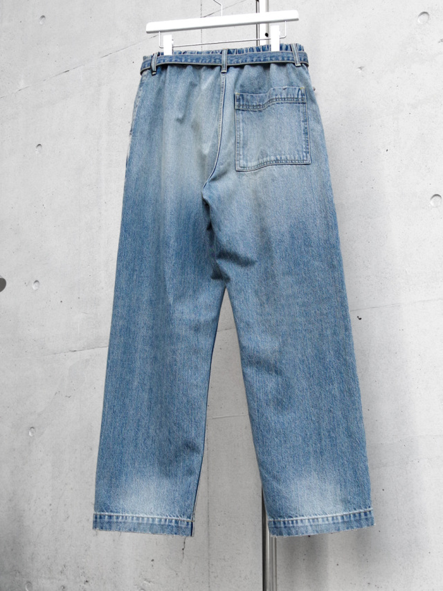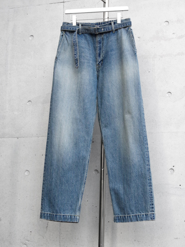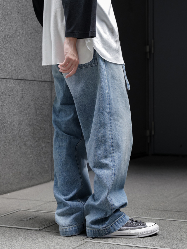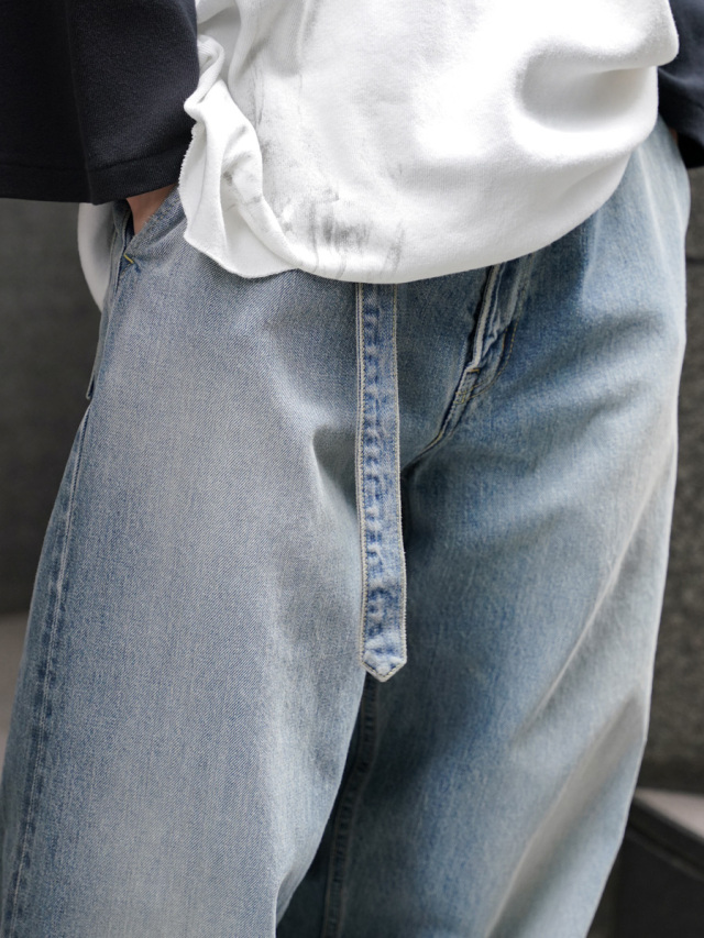 Denim trousers with a wide silhouette inspired by items from a rustic house brand from a very old era. It features a thick straight silhouette that is easy to match with any outfit. A unique look with a long belt made from the same fabric. The tuck button is made of unpainted iron. As it gradually rusts, it develops a unique texture and look.
