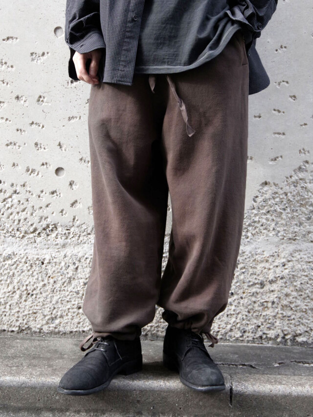 "吊り編みで編み立てたブランドオリジナルのスウェット生地を使用したバギーパンツ。 ウエストと裾に紐が付いており、裾は絞って履いて頂けます。
